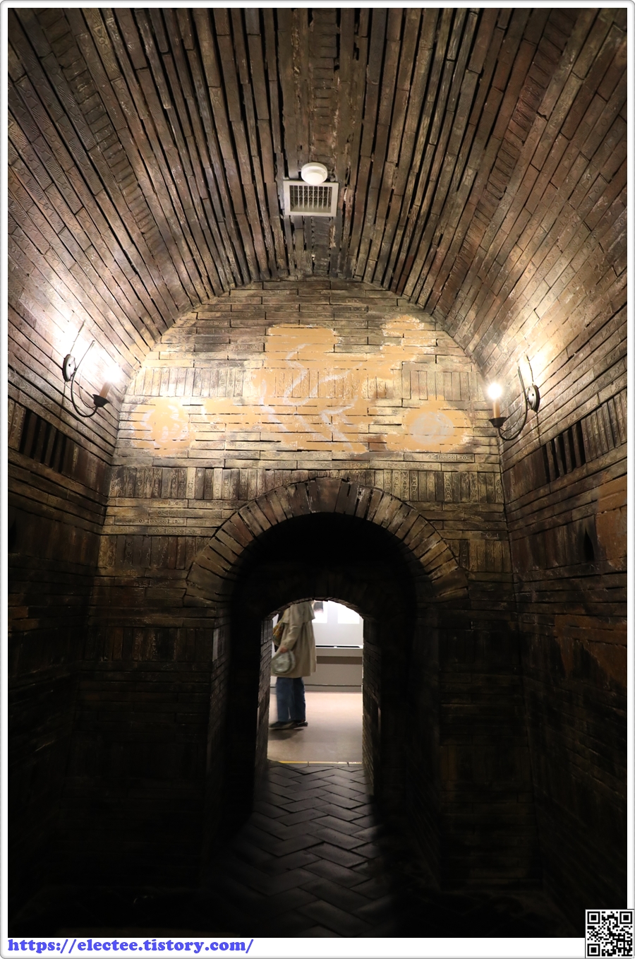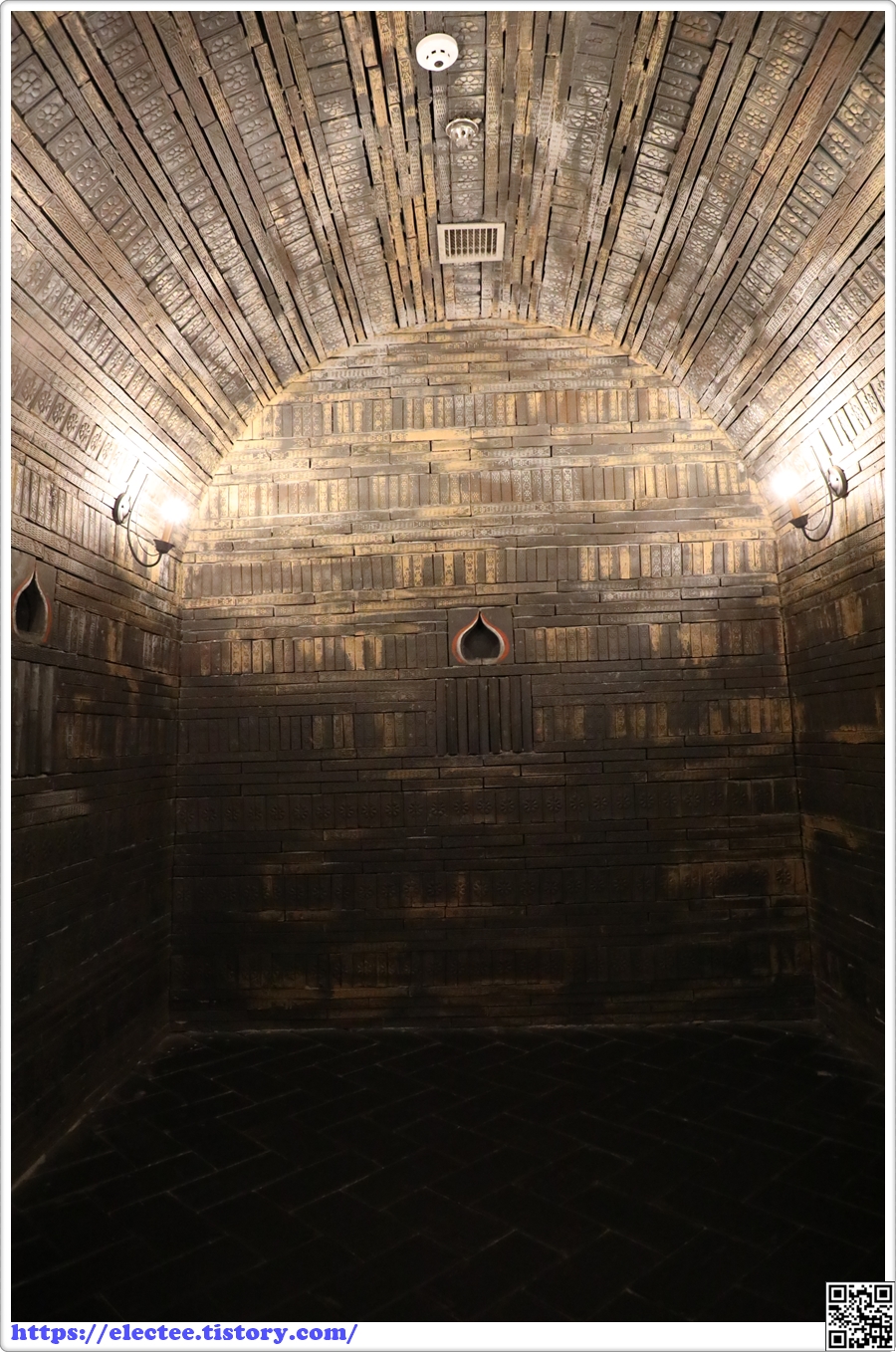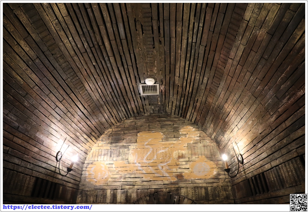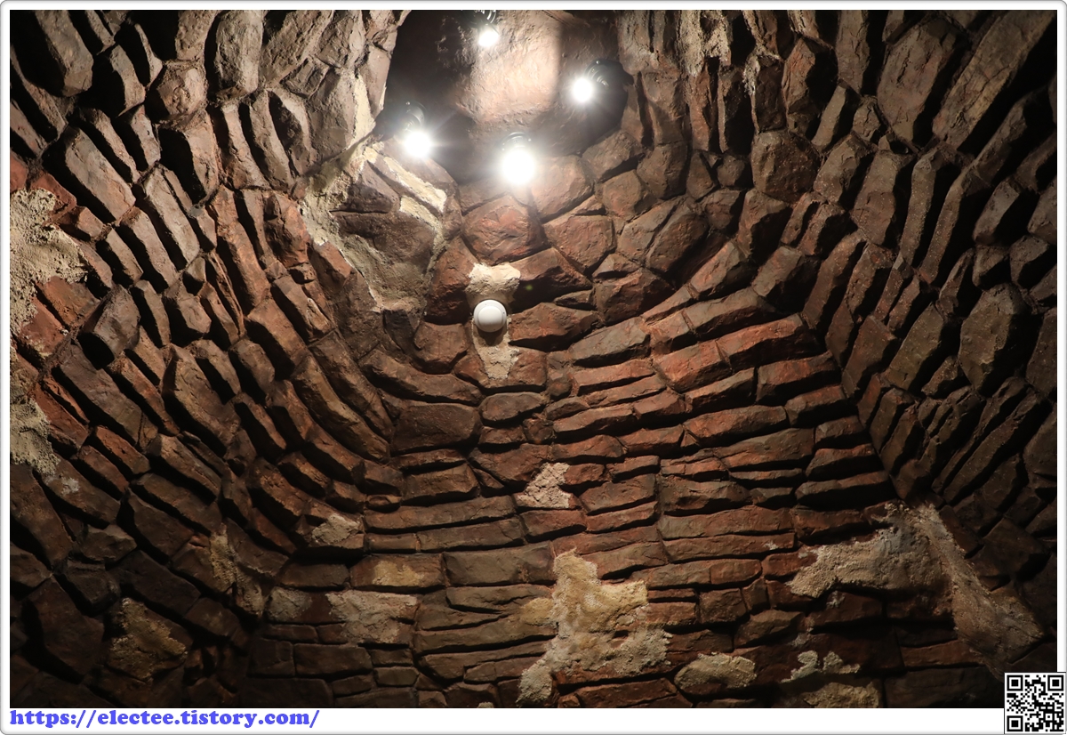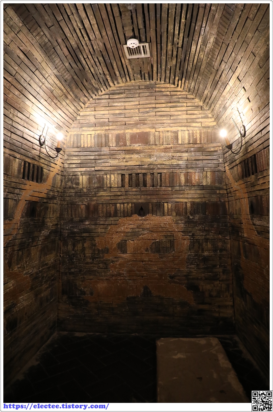 천정의 경우 사다리끌 벽돌을 사용하여 자연스럽게 맞물리도록 쌓아 아치형 천정을 구축하였다.