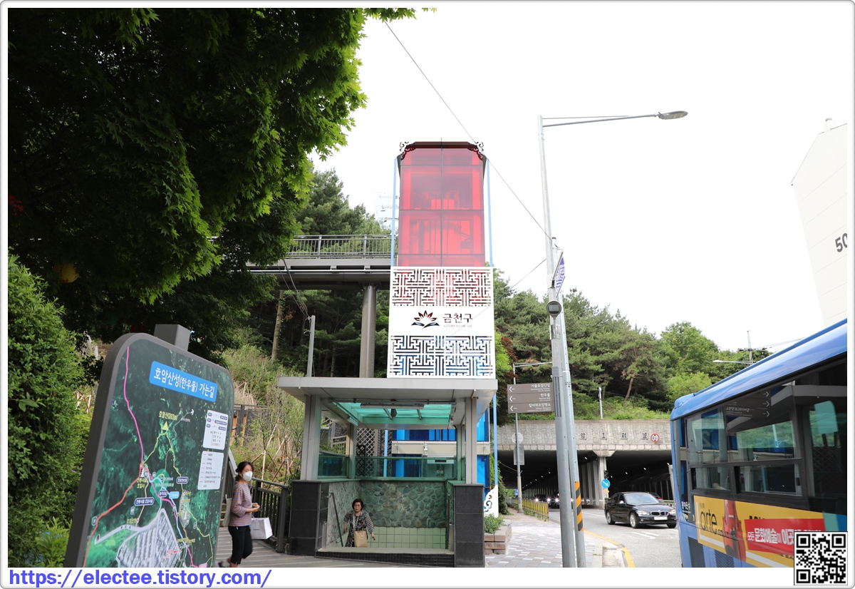 지하철에서 버스로 환승해 정류장에 내리니 산으로 오르는 무장애길과 연결된 엘리베이터가 있다.