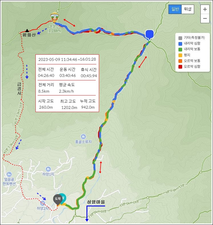 2023.5.9. (화) 11:34~16:01, 8.5km 산행, 4시간 26분 소요, 46분 휴식, 평속 2.3km/h