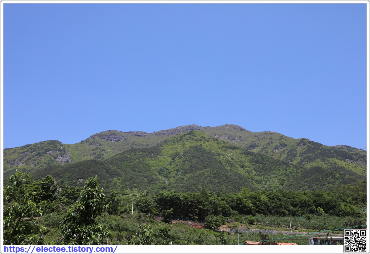 마을 입구에서 바라보는 가운데 안부를 중심으로 왼쪽이 운문산, 오른쪽은 가지산 능선이다.