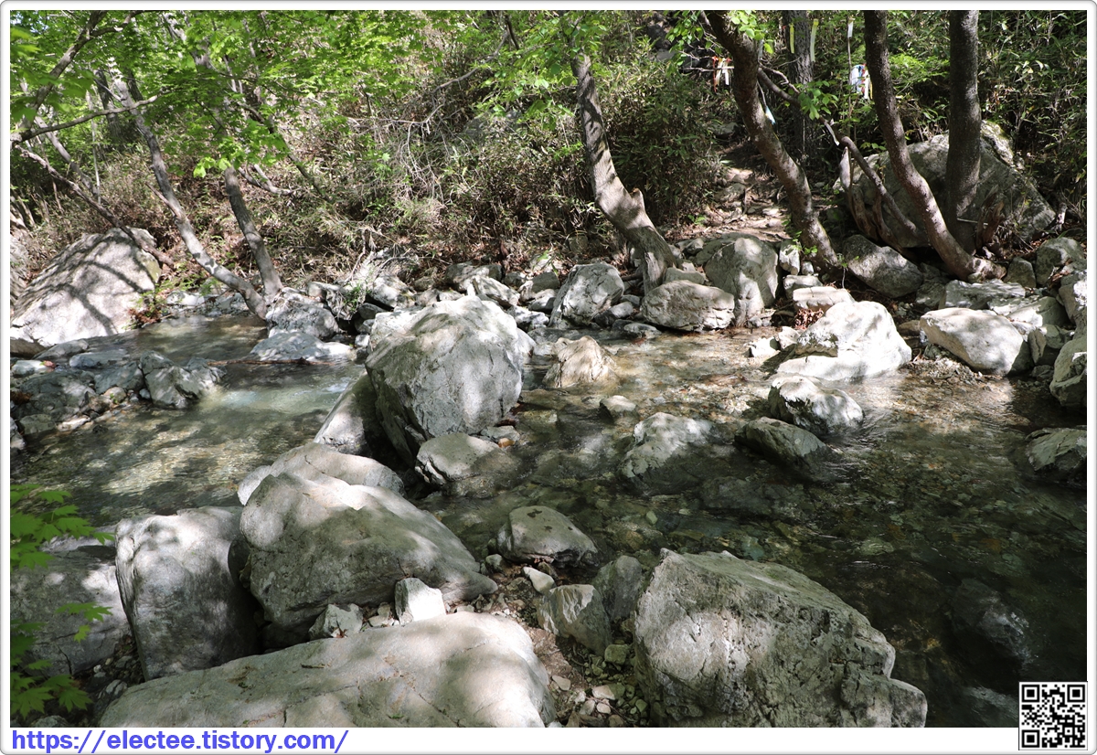 갈림길에서 바로 개울을 건너야 하는 데, 비가 많이 오면 이 개울은 건널 수 없다.