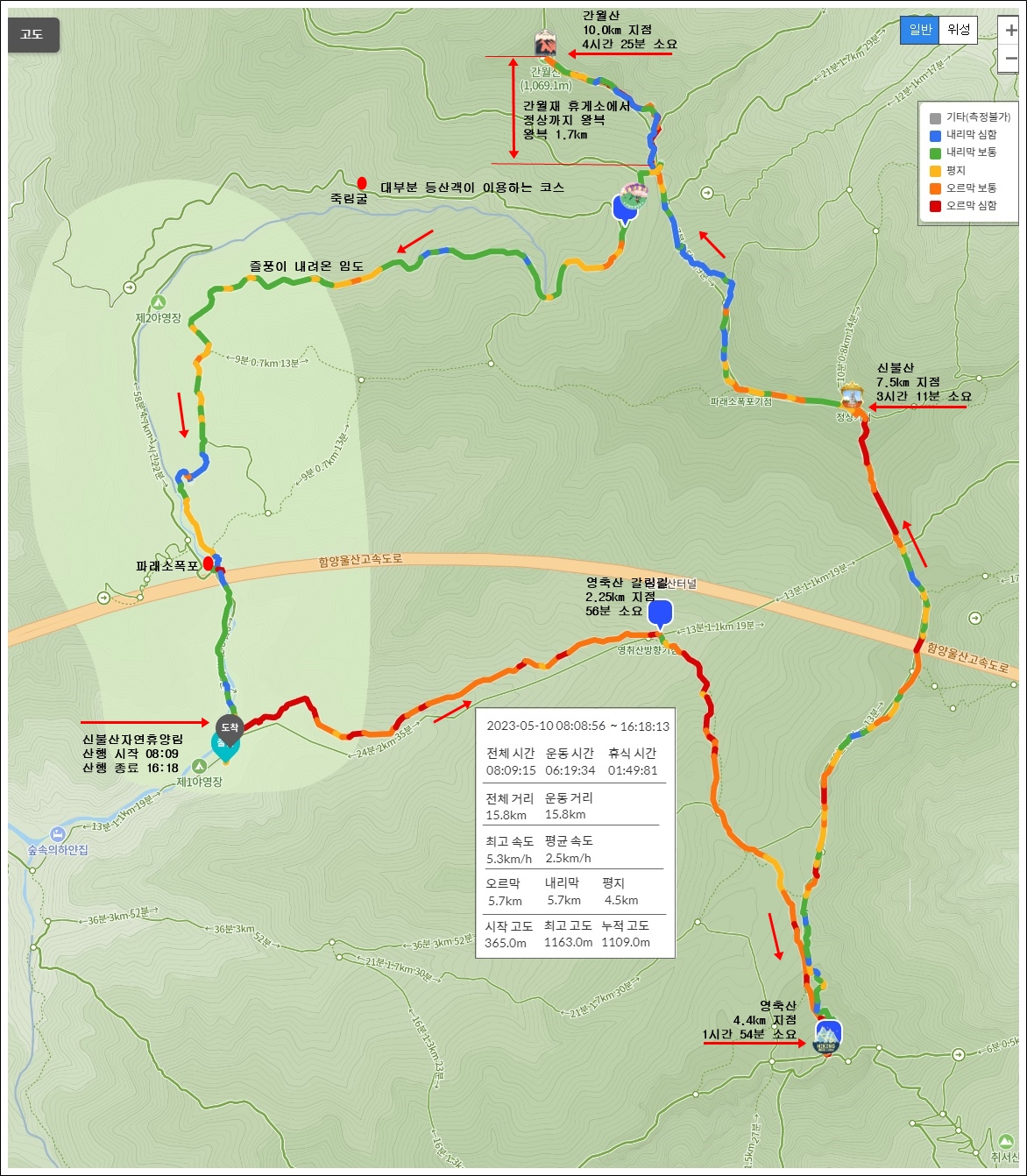 2023.5.10. (수) 08:09~16:18, 6시간 19분 산행, 1시간 50분 휴식, 15.8km 이동(영축, 신불, 간월산 포함)