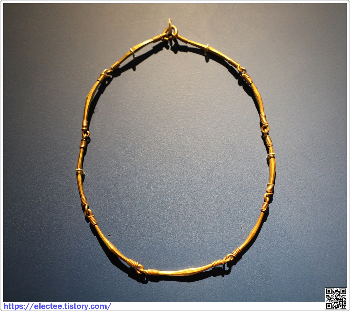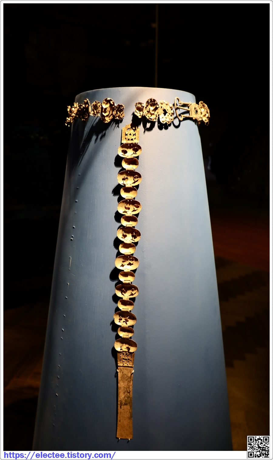 목걸이에 연결된 구슬 장식은 한 줄로 내려와 배 위의 장식을 중심으로 두 갈래로 나뉘어 뒤로 연결된다. (안내문)