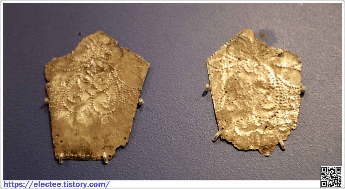 한편 왕비의 머리부근에서는 사각형과 오각형 금판장식이 함께 출토되었는데,