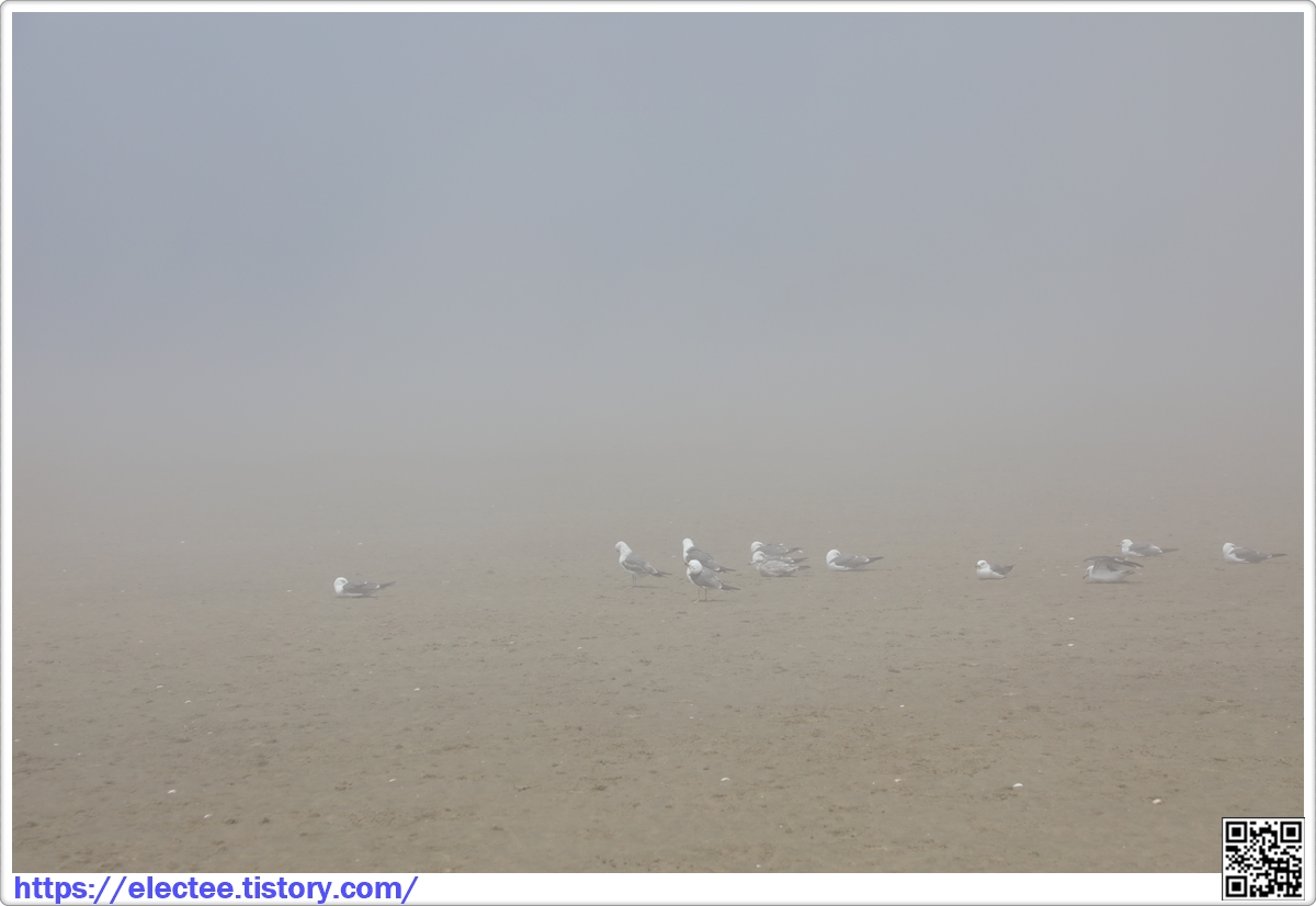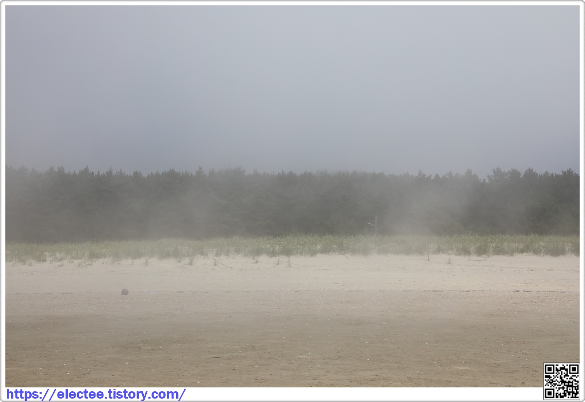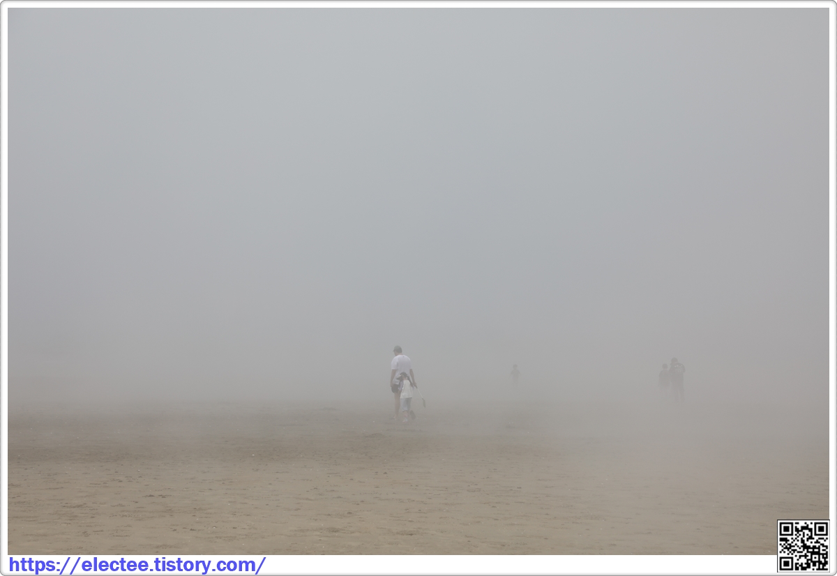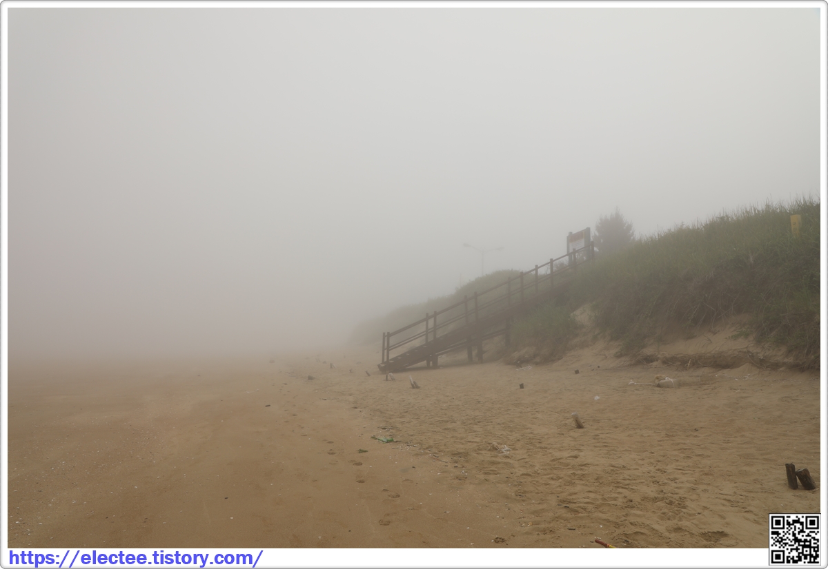 물안개가 뽀얗게 생기며 한 치 앞도 바라볼 수 없는 풍경이라 더 볼 것도 없이 해수욕장에서 나온다.
