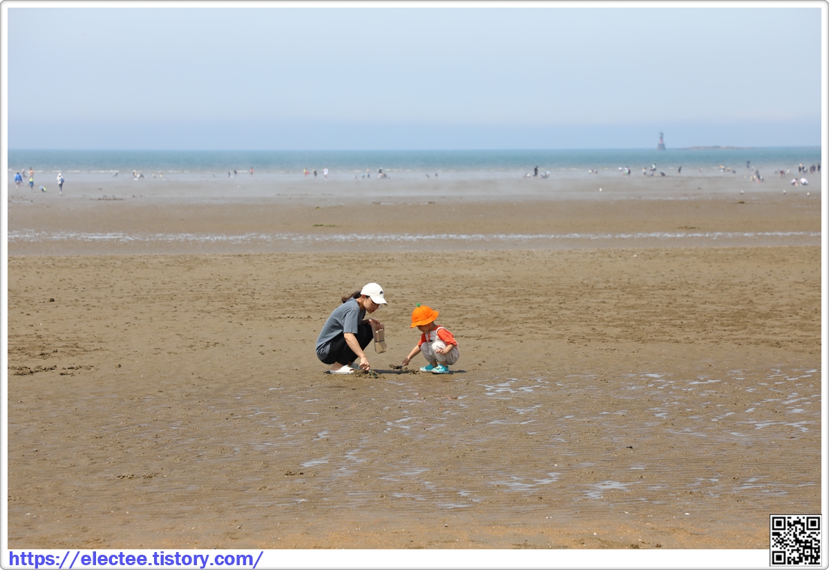 가족과 함께 나온 사람들은 아이들과 조개 캐기 체험을 한다.