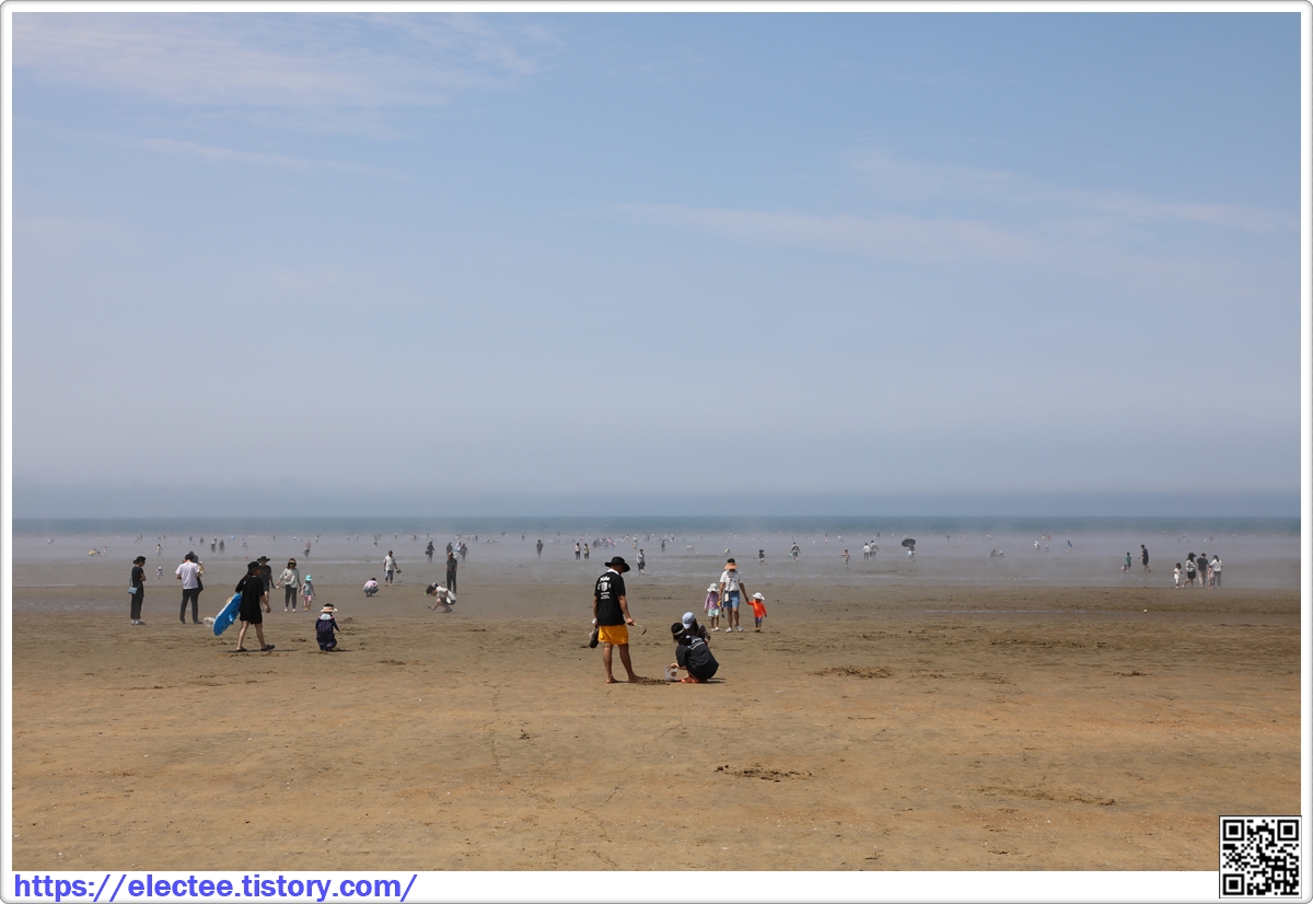 물이 다 빠져 드러난 학암포해수욕장은 햇빛이 강해 모래사장이 마르며 수증기를 연신 뿜어댄다.