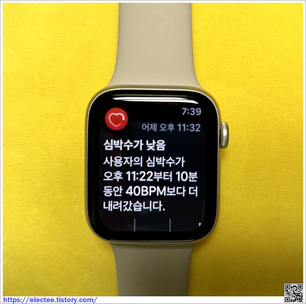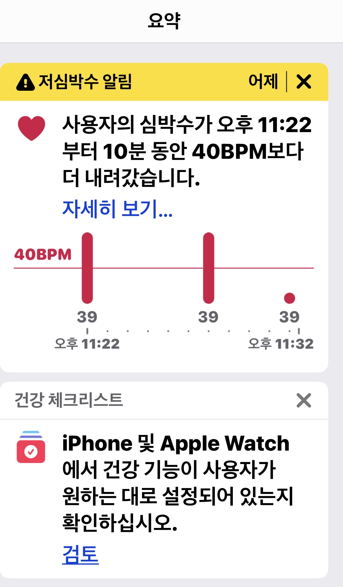 심박수가 40 BPM 미만으로 떨어졌다는 알림을 받았다.