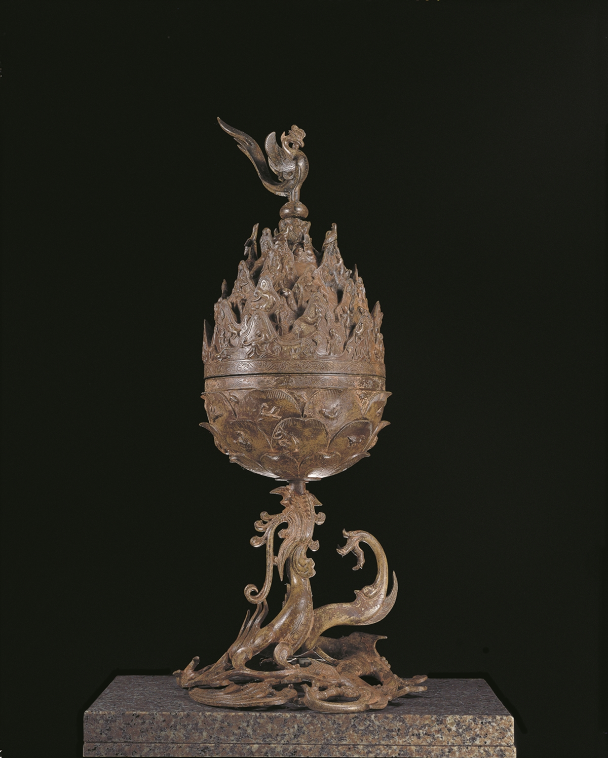 활짝 피어난 연꽃을 연상시키는 아래의 몸체는 하나하나의 연잎의 표면마다 불사조와 물고기, 사슴, 학 등