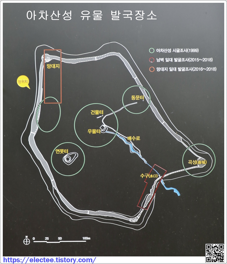 아차산성은 부정 육각형의 포곡식 산성으로 둘레는 1km가 조금 넘는다.
