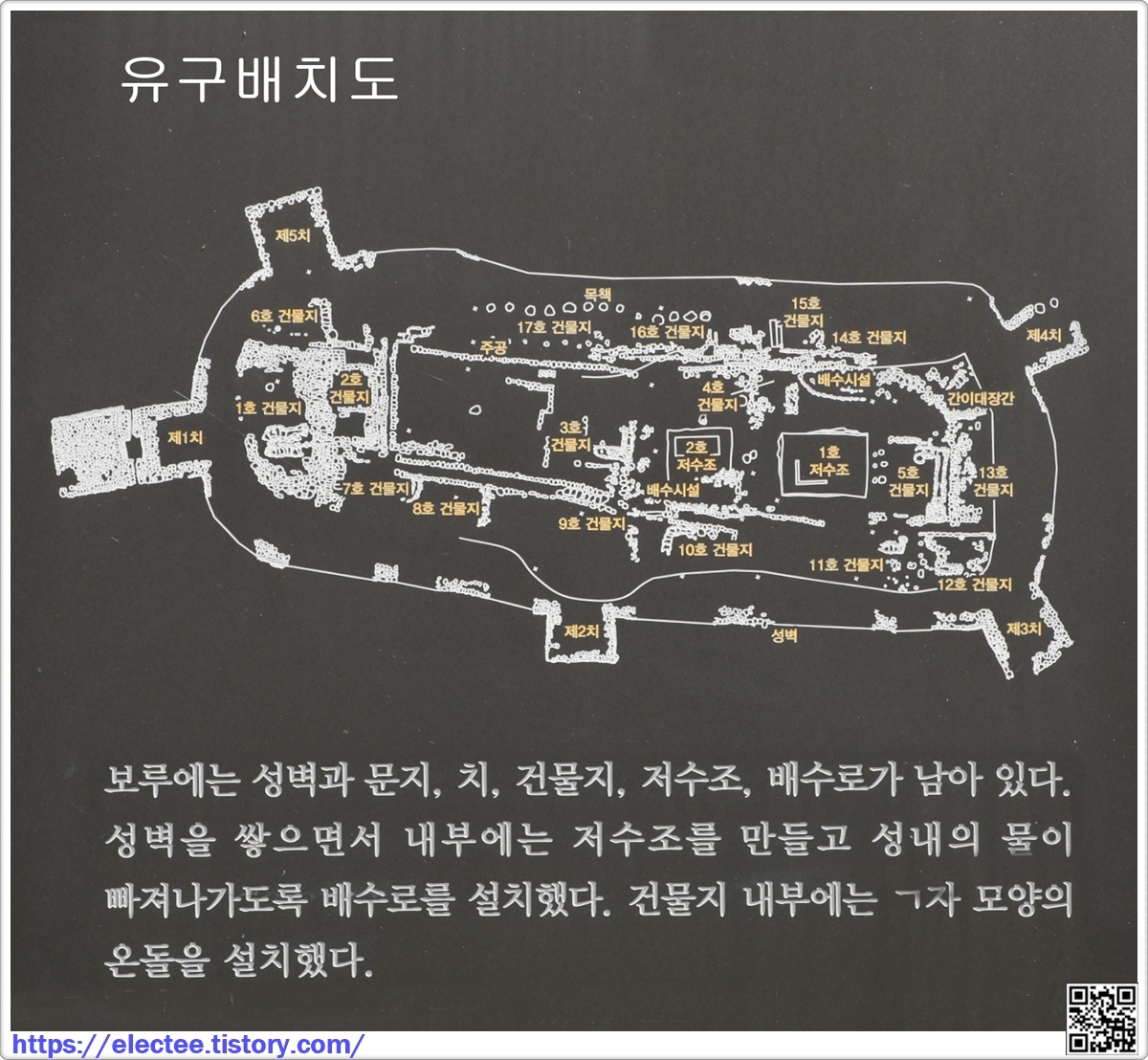 지형상 평지와 비탈면 경계지점에 석축 성벽을 쌓고 성벽 안쪽에 생활시설을 만들었다.