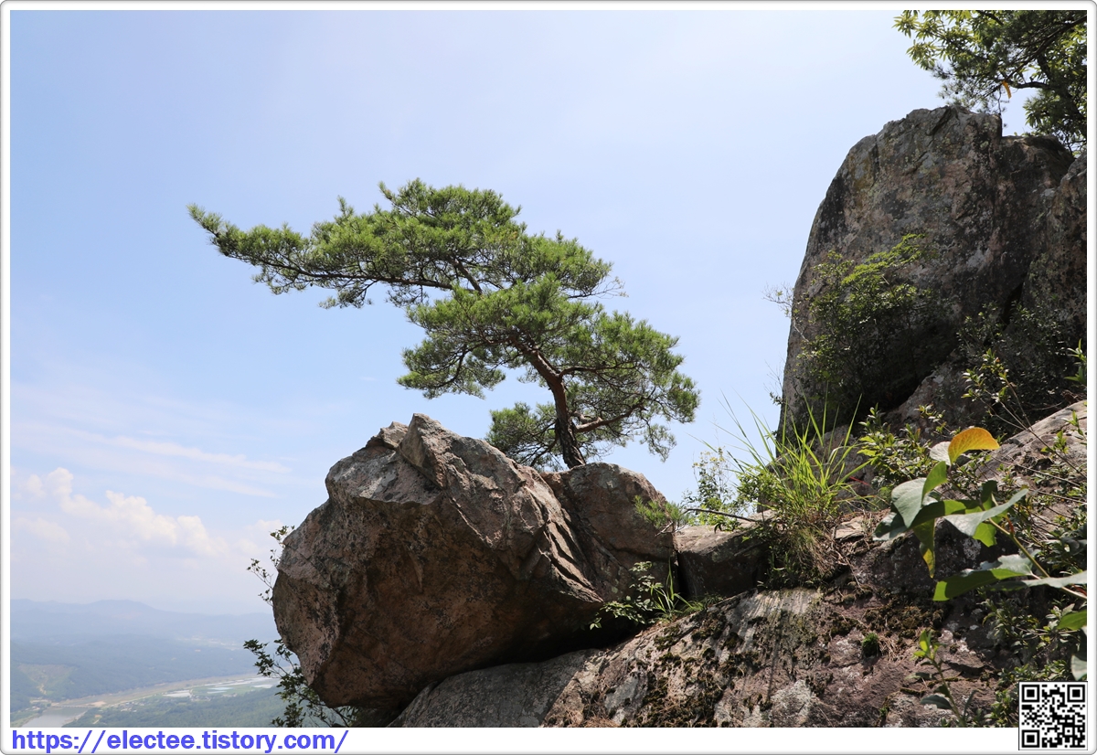 정상을 제법 앞두고 바위 사이를 가른 소나무가 운치 있다.