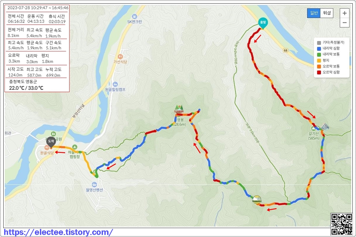 2023.7.28. (금) 10:30~16:45, 6시간 16분 산행, 두 시간 휴식, 8.1km 이동, 평속 1.9km/h,