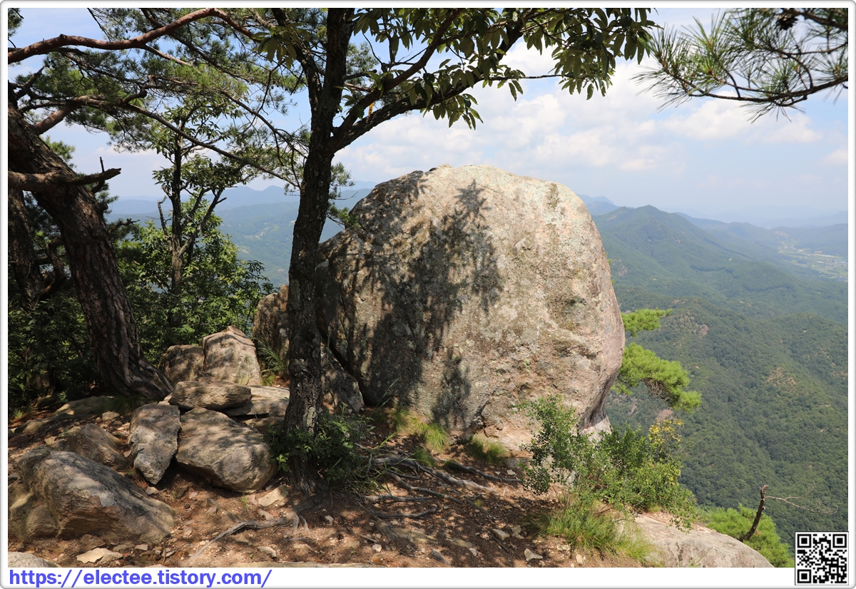 정상부가 바위봉우리여서 거침없는 시야를 확보할 수 있기 때문에 정상에 오르면 갈기산 천태산,