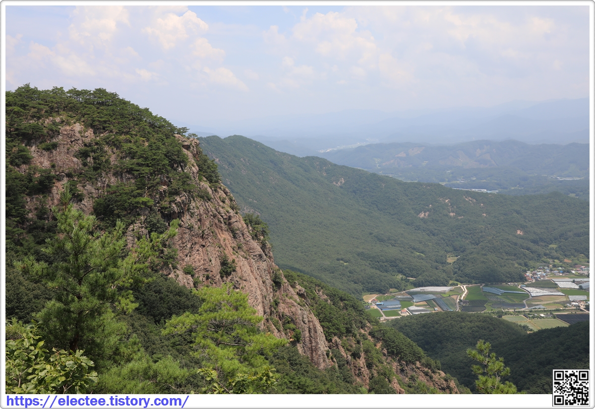 정상부 북쪽 발아래를 내려다보면 금강이 제원면의 산하를 휘저으며 흐르는 장관도 함께 펼쳐지는