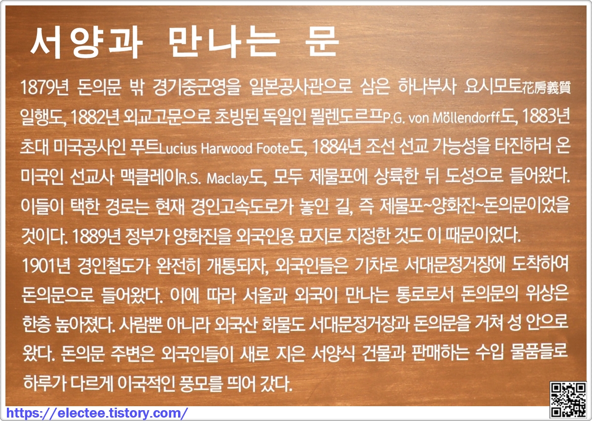 도성의 서쪽 대문인 돈의문 밖으로는 북쪽으로 무악재를 넘어 의주로 통하는 길과 서쪽으로 애오개를 넘어
