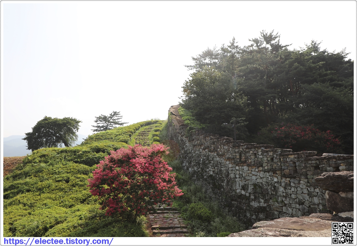 성벽 밖은 봄철에 철쭉꽃이 흐드러지게 피는 데, 지금은 배롱나무 꽃이 활짝 피었다.