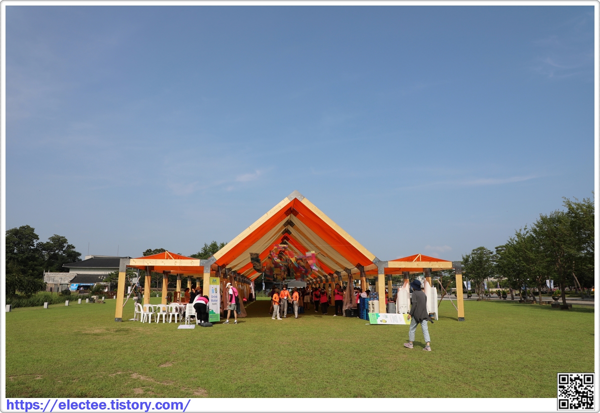 모양성공원에서는 천막을 치고 바자회가 열린다.