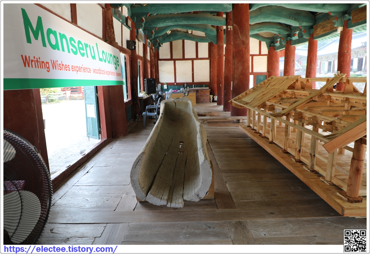 대웅전 모형 옆에는 소 여물통이 한껏 크기를 뽐낸다.