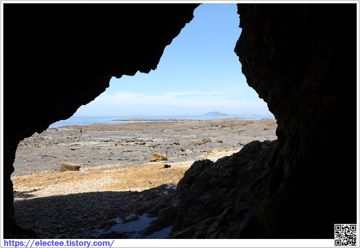 곰소유문암 내에 발달한 주상절리와 차별침식으로 형성된 소규모 해식동굴은 좀 전에 본 작은 동굴이다.