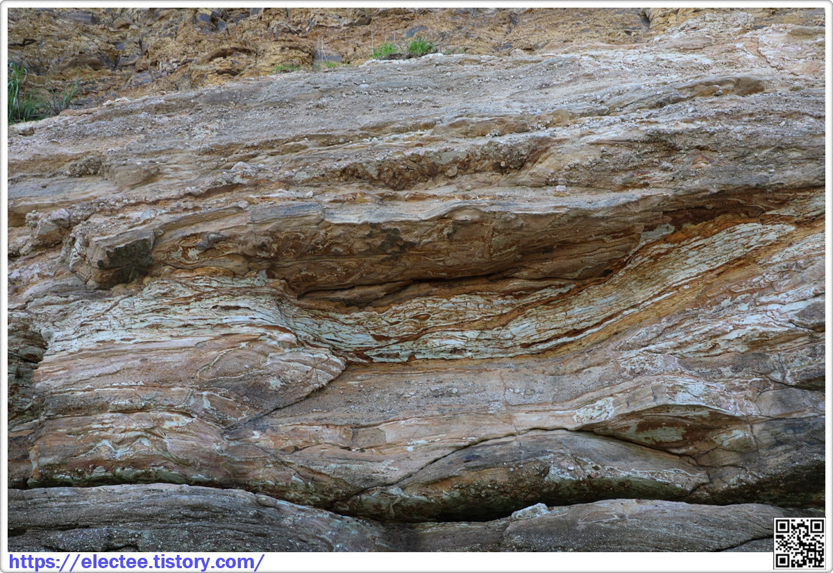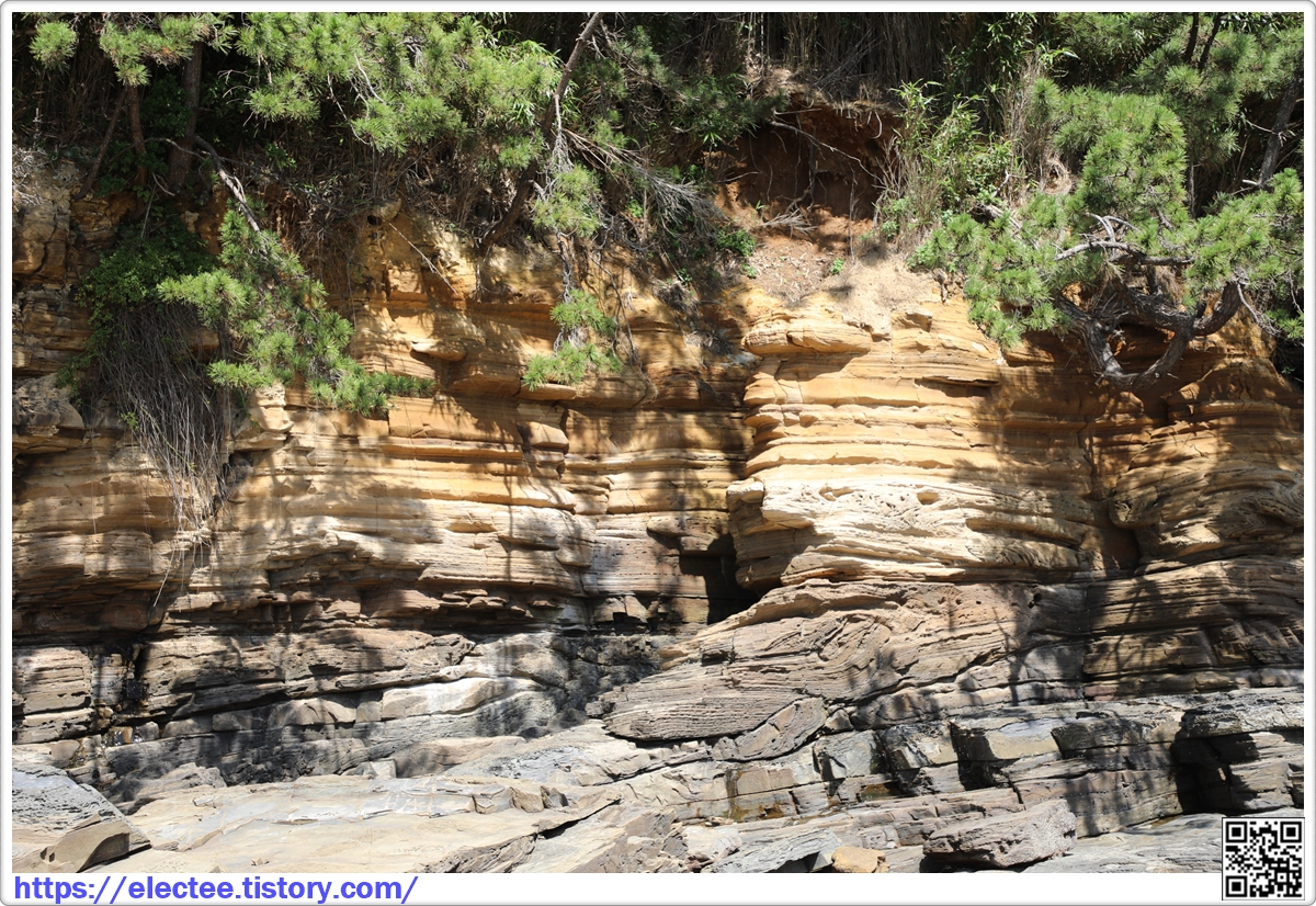 바닷물의 침식을 받은 화산성 퇴적암층은 격포리층으로 역암 위에 역암과 사암, 사암과 이암의 교대층,