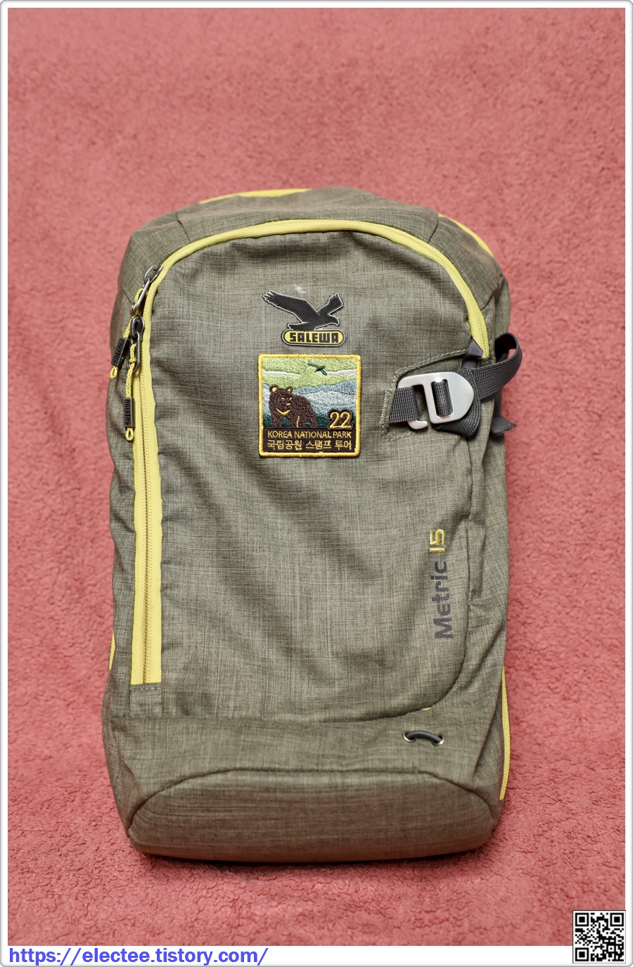 22개 완주 기념품인 자수 패치는 가장 사용 빈도가 많은 24리터 배낭에 박음질로 고정했다.