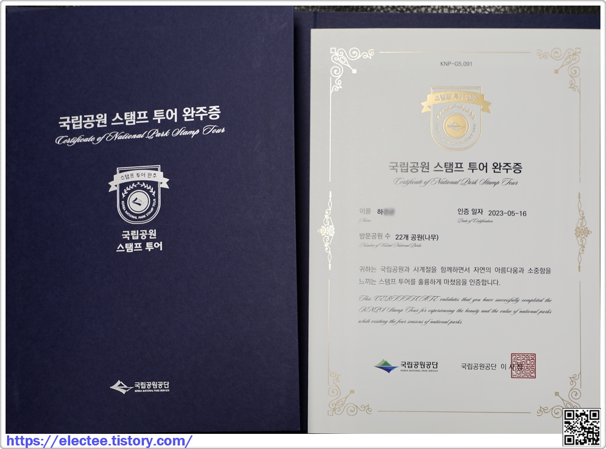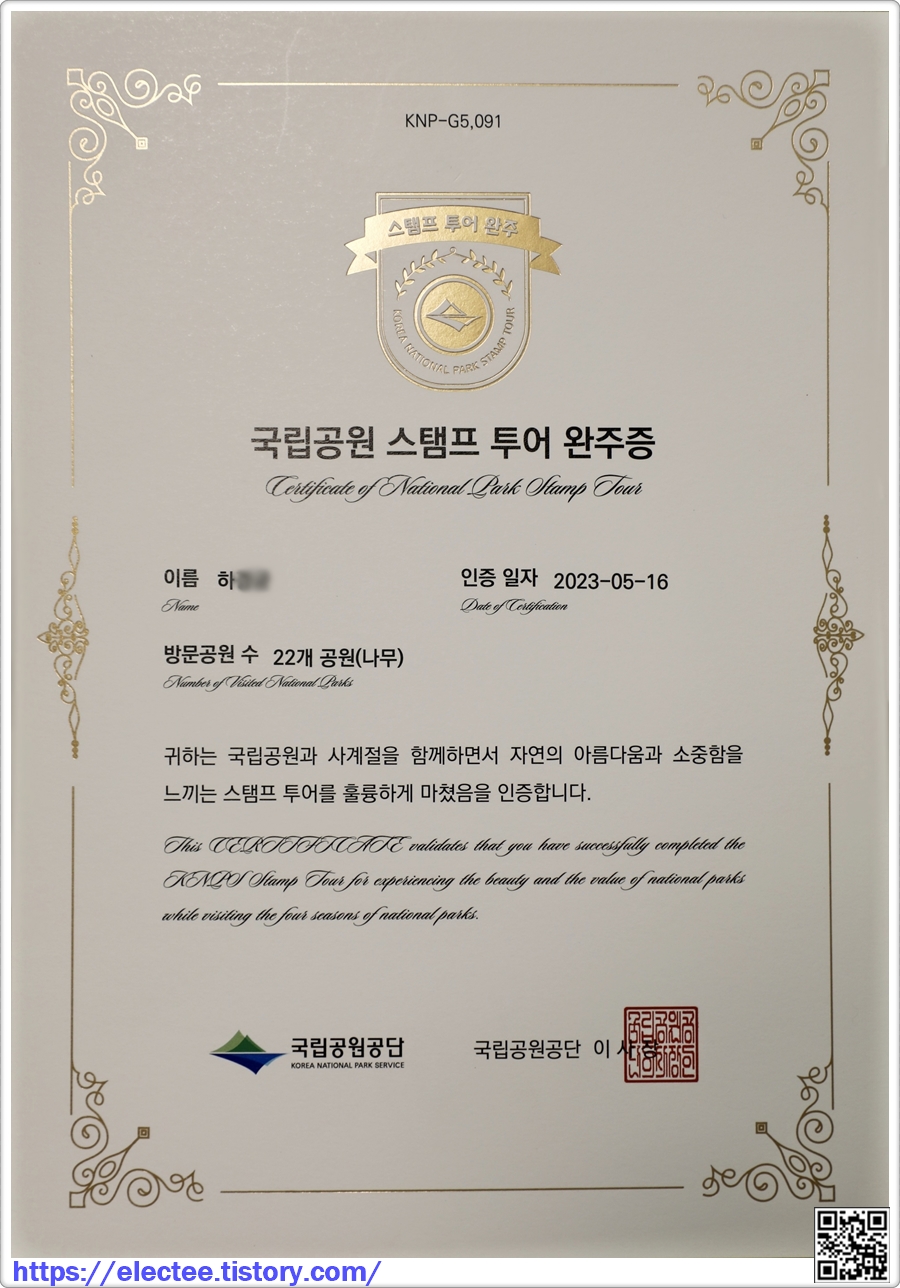 드디어 오늘('23. 8. 19. (토)) 기다리던 국립공원 스탬프 투어 완주증을 수령했다.