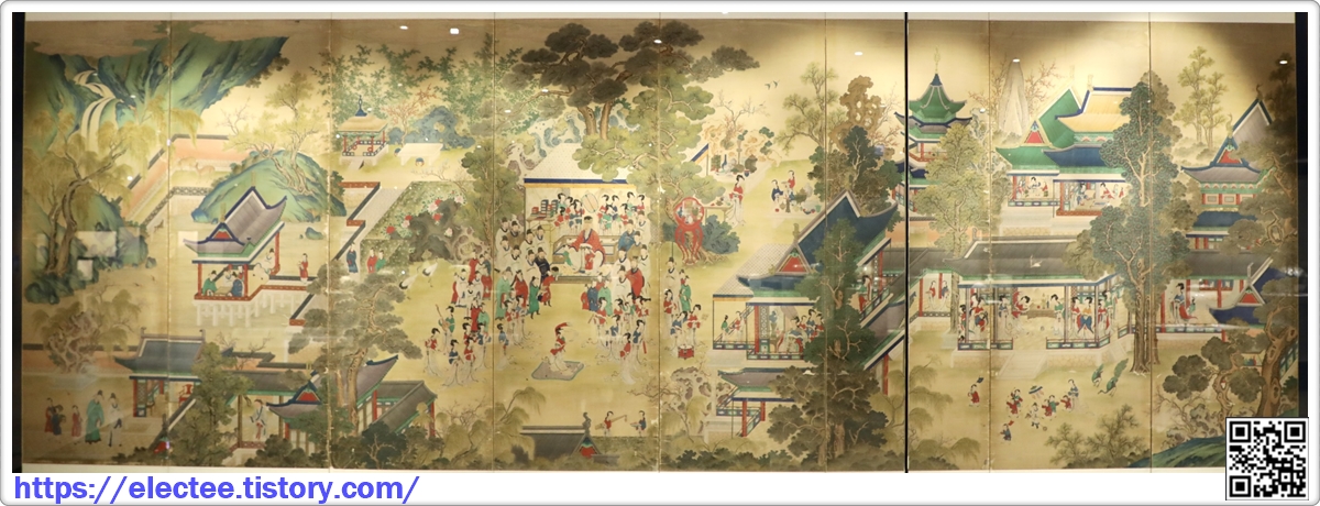 오른편 세 폭은 과분양 집안의 모습을 그린 것으로, 여성들과 아이들이 평화로운 시간을 보내는 장면을 담았다.