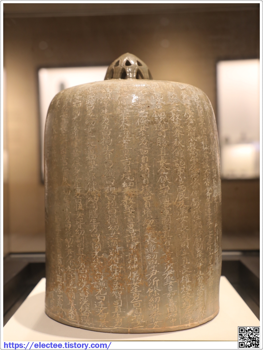 상단의 연꽃봉오리를 투각으로 장식한 종 모양의 분청사기와 해서체로 정갈하게 새긴 글씨는