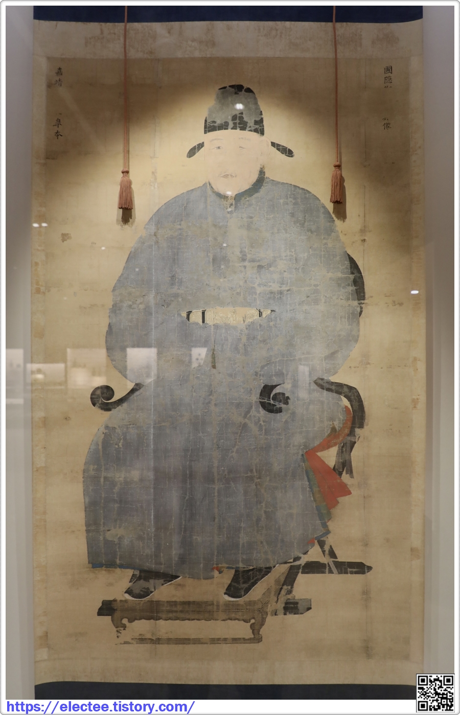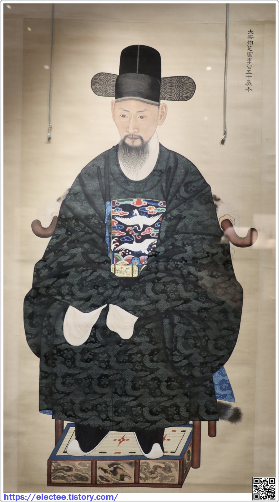 오사모에 쌍학 문양의 흉배가 부착된 단령을 입고, 정 2품의 관직을 나타내는 삽금대鈒金帶를 두르고 있다.