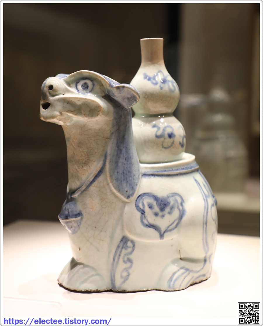 분원 말기의 기형으로, 형태도 의젓하고 청화문양과 조각장식도 솜씨가 뛰어나다. (안내문)