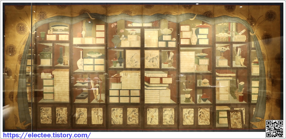 각목마다 놓인 책과 책갑冊匣은 서가의 주인이 학식을 갖춘 인물이라는 것을 나타낸다.