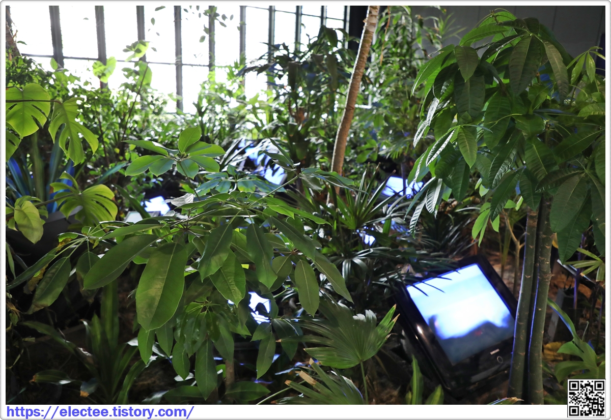 작은 정원을 설치한 후 여러 대의 작은 모니터엔 똑같은 화면이 지나간다.