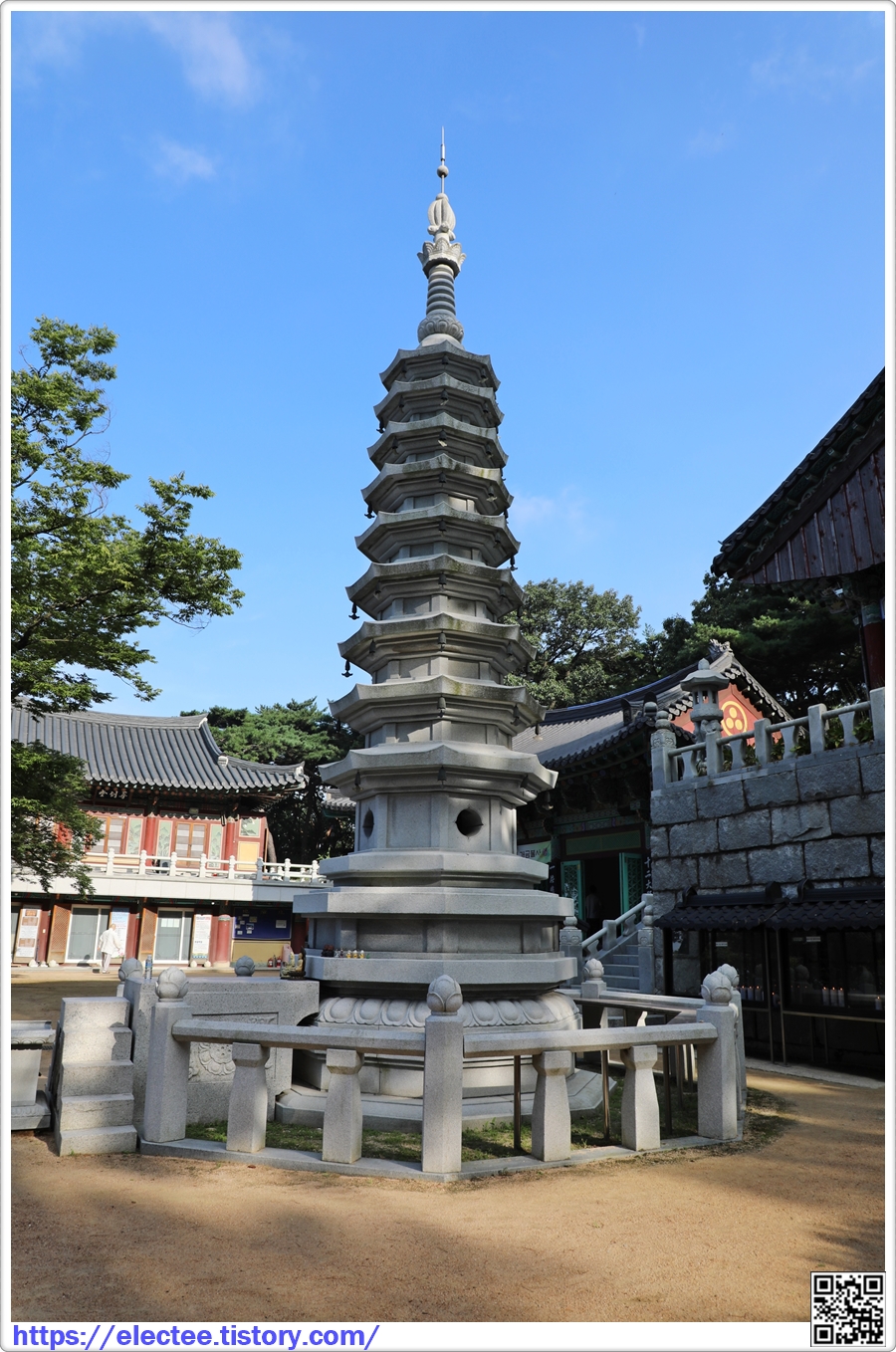최근에 올린 것으로 보이는 9층 석탑은 층간 간격이 좁다는 느낌을 준다.