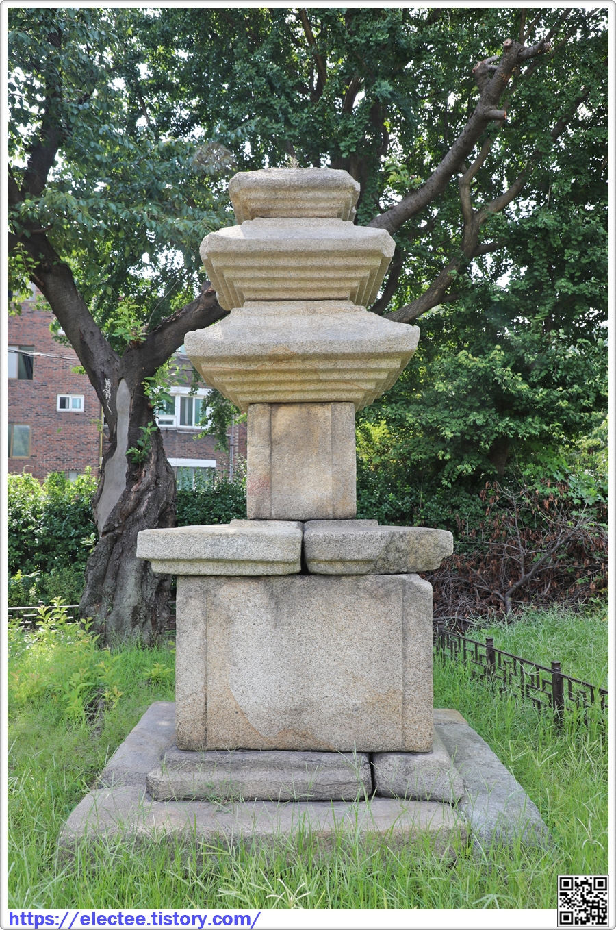 넓은 지대석 위에 2단의 면석 괴임을 마련하여 기단부를 구성하였으며, 그 위에 총 3층의 탑신부를 올렸다.