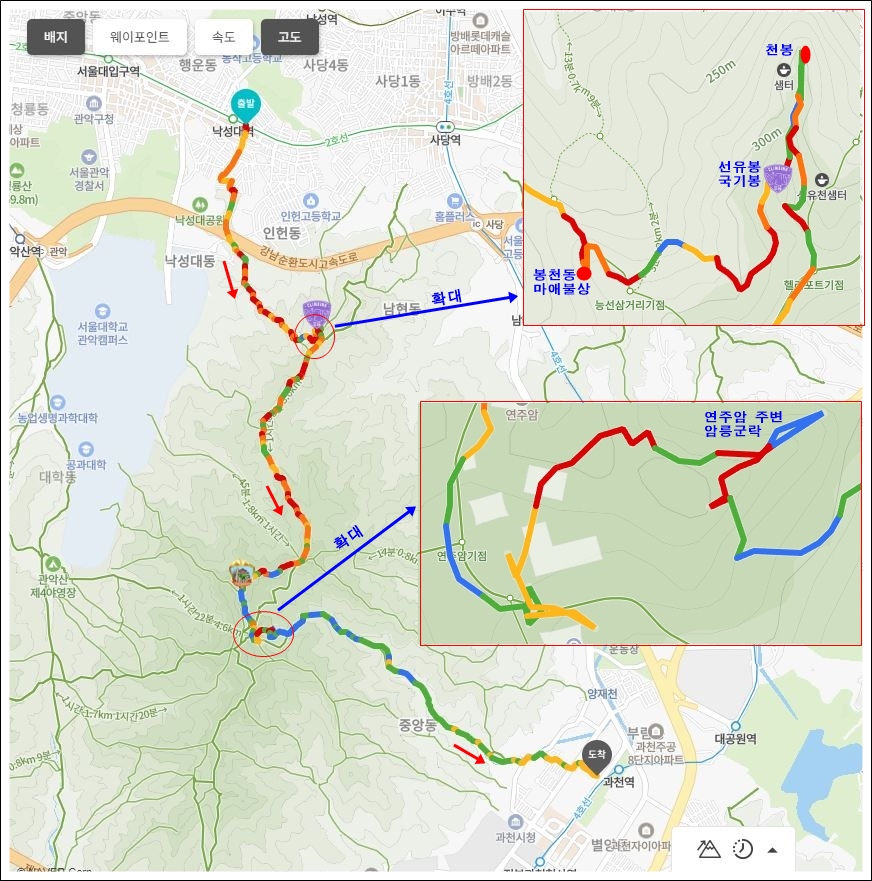 낙성대역이나 사당역 어느 쪽에서 시작하든 날머리까지 산행시간은 비슷하다.