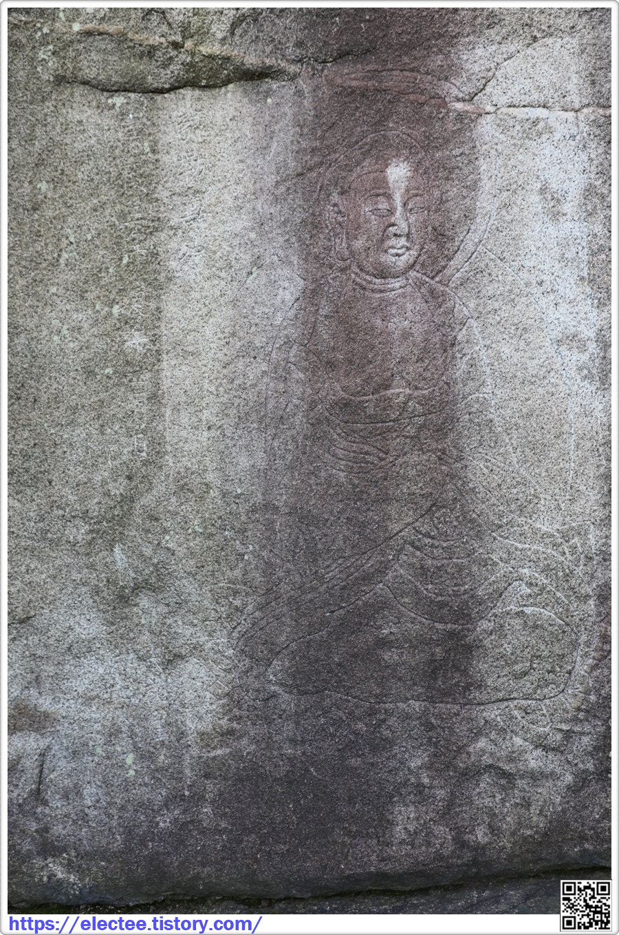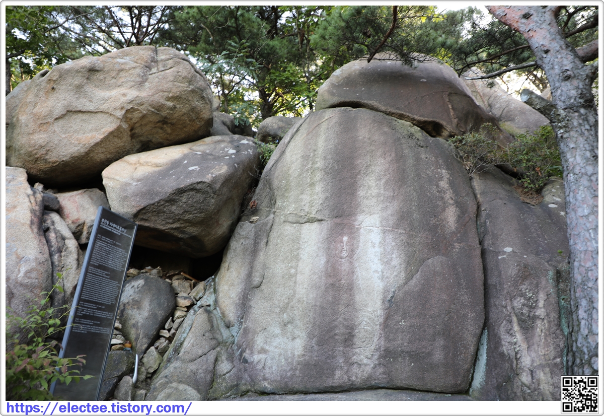 This Buddha statue is carved in shallow relief on the surface of a huge rock on the northern slope of Gwanaksan (Mt). The statue measures 1.6 meters in height, and there is an inscription indicating that the statue was produced