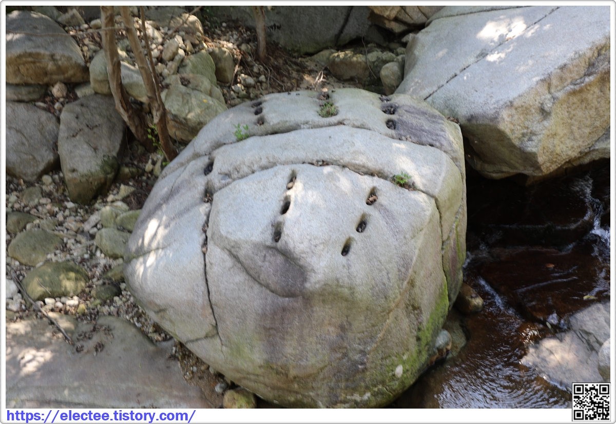 개울에 있는 바위를 자르려고 여러 홈을 만들었다.