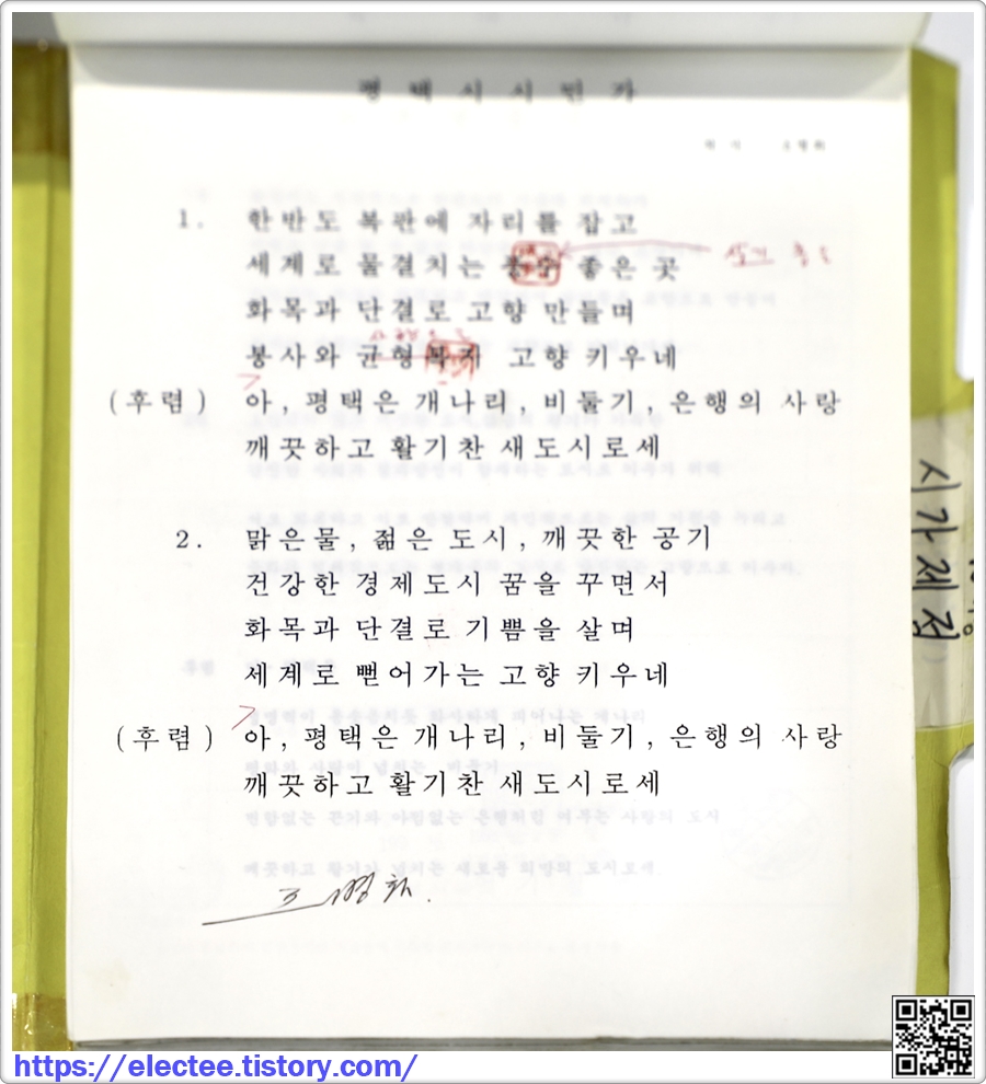 후렴 : 평택 모두가 꿈꾸는 행복한 세상 평택 삶의 기쁨 가득한 따뜻한 도시 오늘의 즐거움 내일의 희망