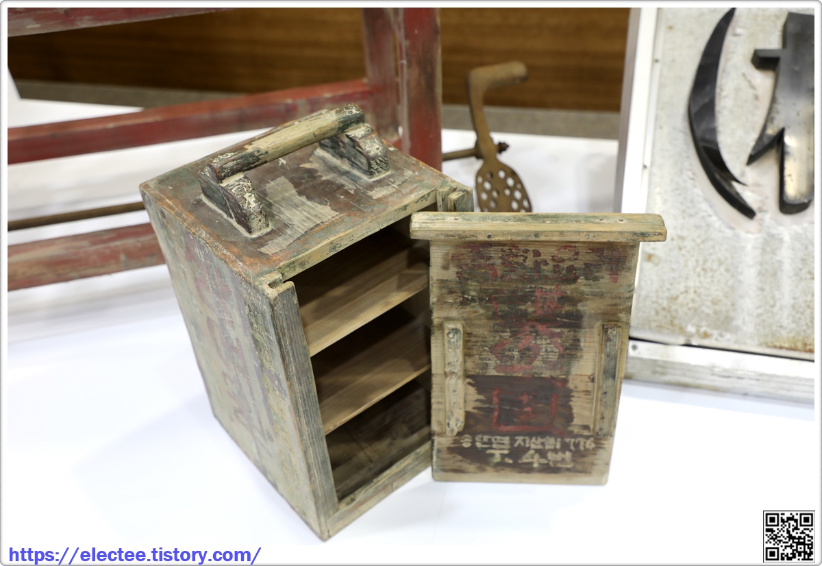 새끼틀과 숯울 넣는 다리미, 풍구, 되가 보인다.