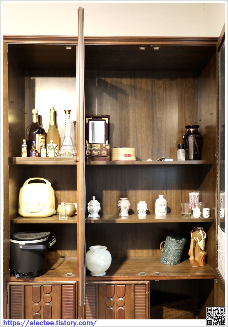 전기밥솥과 술병, 몇 개의 장식품이 이 방의 주인 성격을 말해준다.