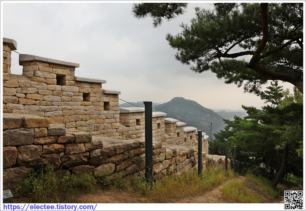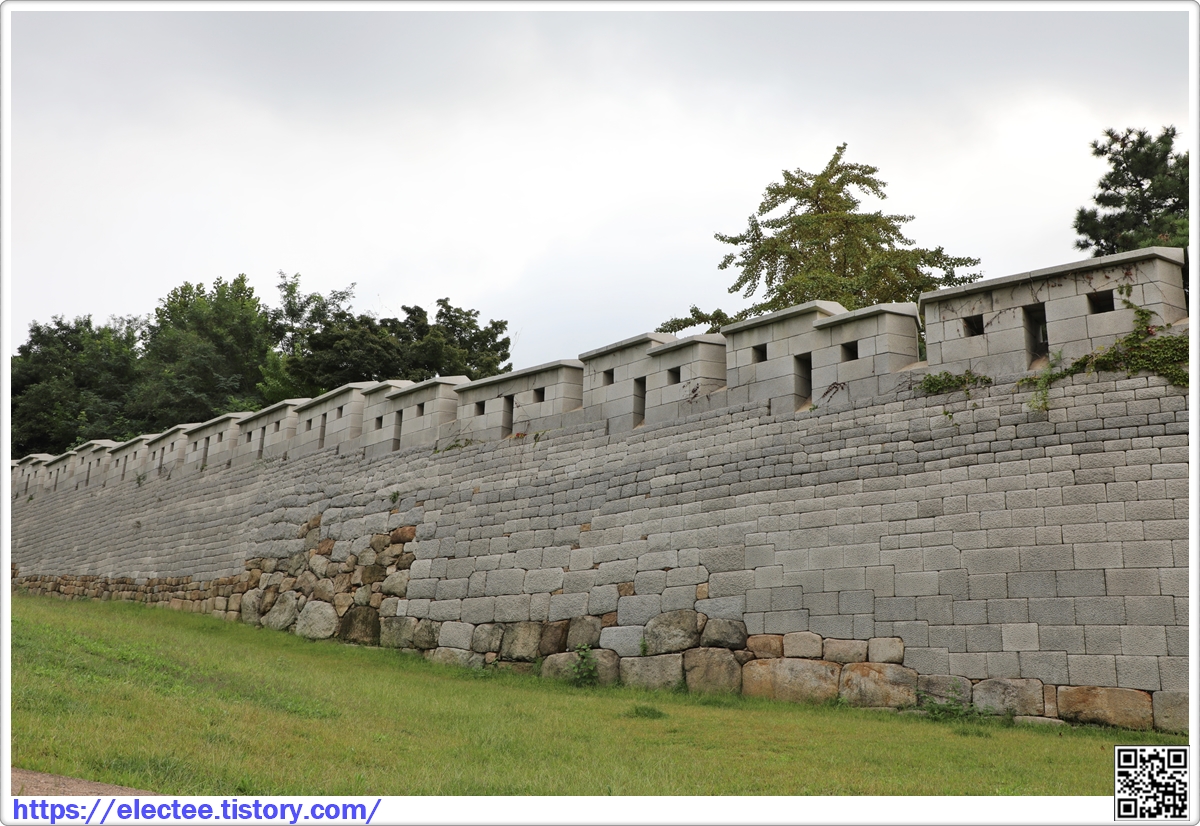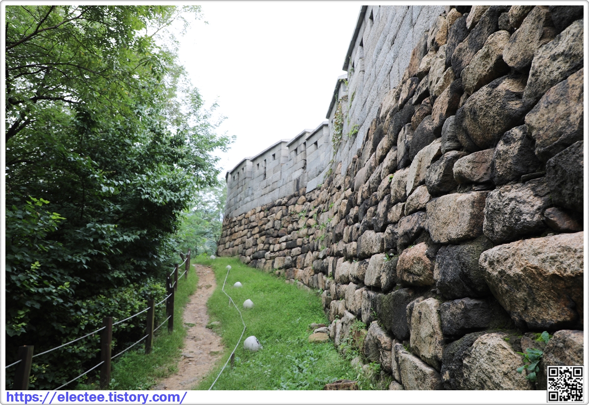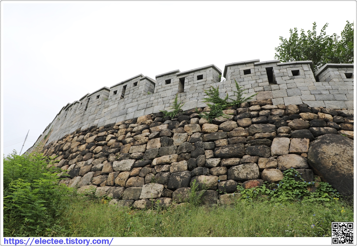 남아 있던 성돌 위에 기계로 자르고 깎은 현대식 성돌이 맞물리며 성벽 한양도성에 위에는 여장까지 설치했다.