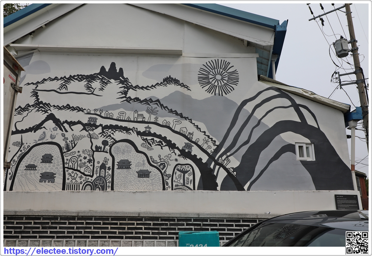 빈집을 헐어내고 임시주차장을 만든 곳 옆집 벽에 벽화를 그려놓아 운치를 더했다.