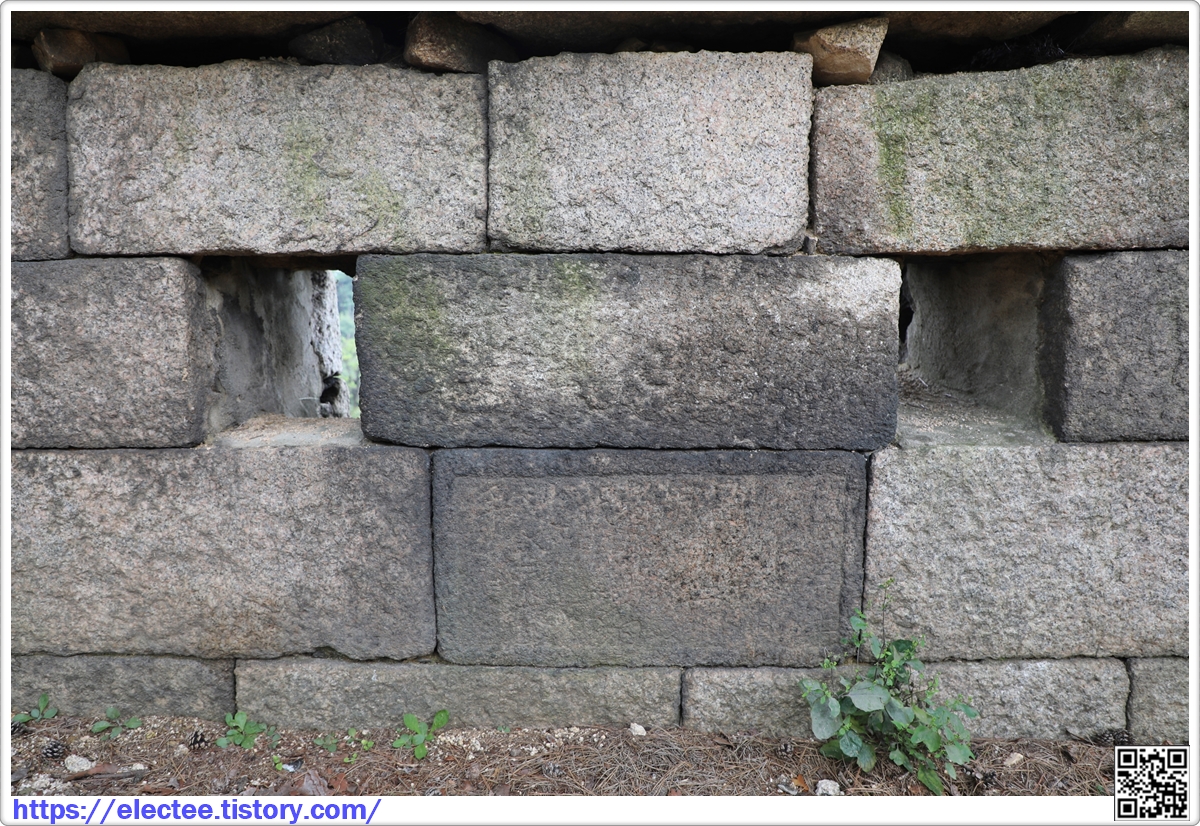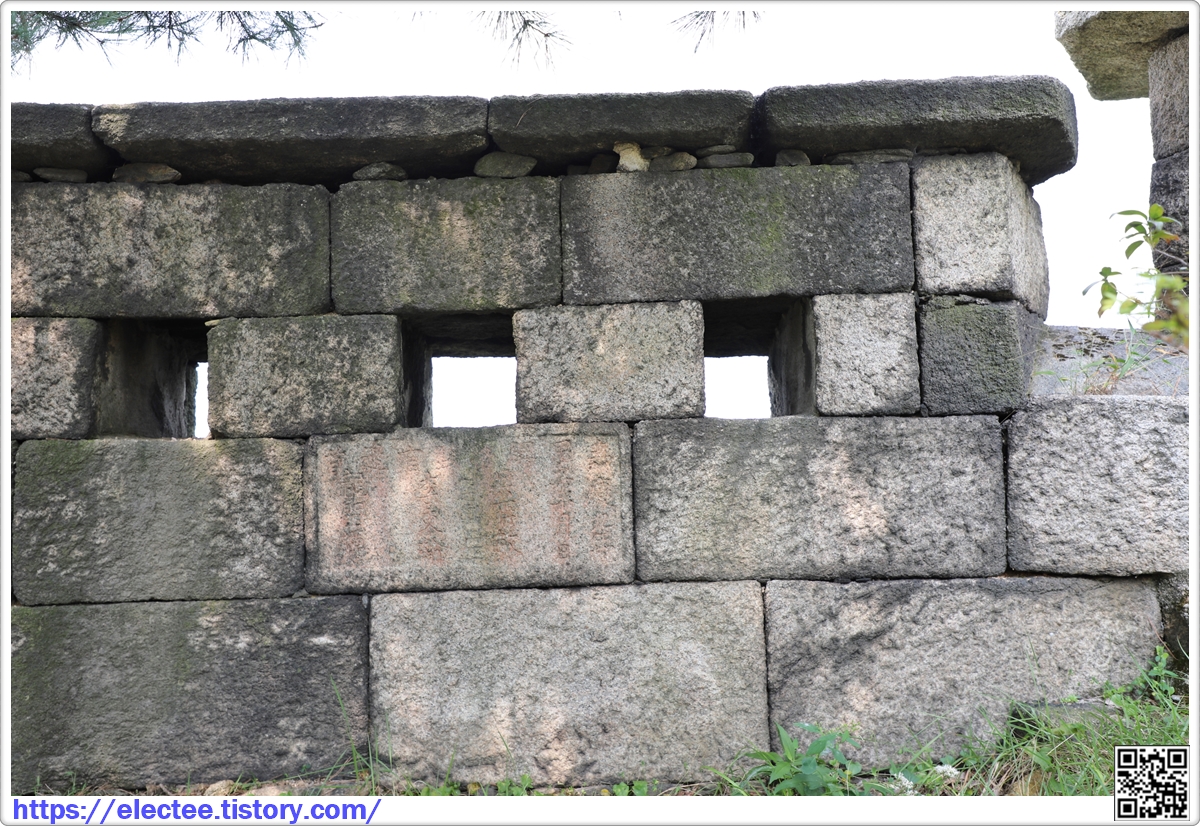 This inscribed stone states that in October 1804, the fourth year of King Sunjo's reign, foreman O Jae-min headed the work to repair the wall, Yi Dong-han supervised the work and stonemason, Yong Seong-hwi, participated in it.