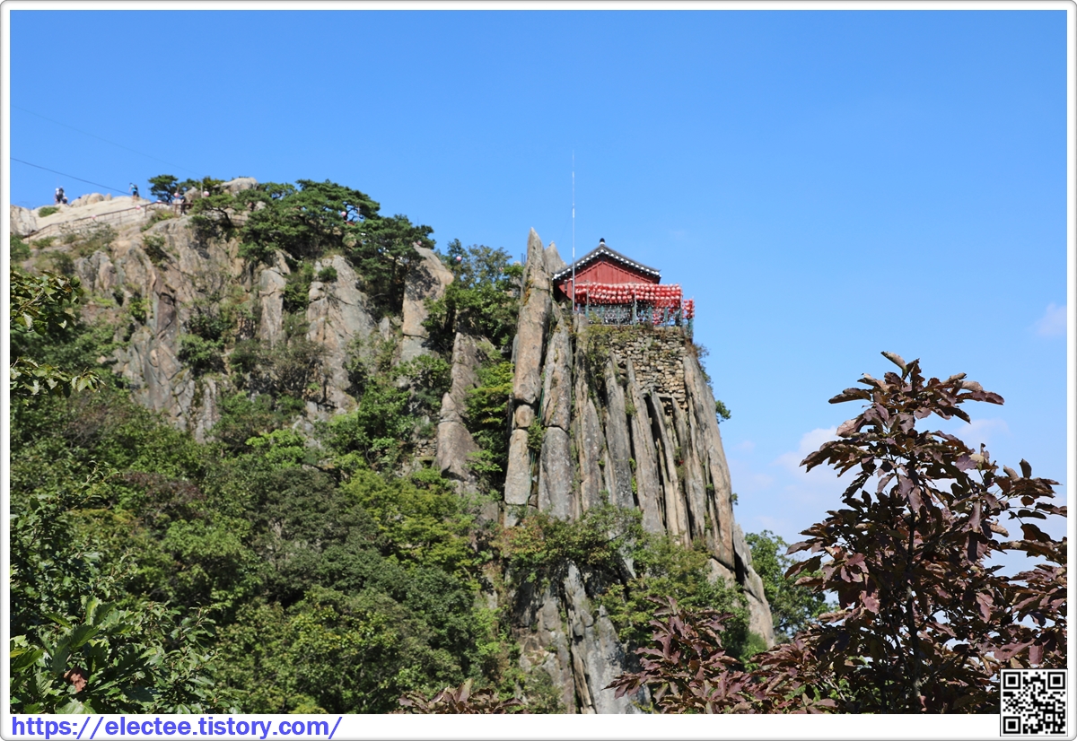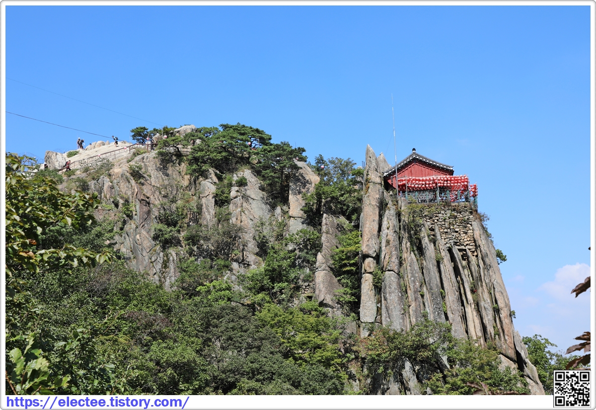 기상레이더가 설치된 원형 흰색 구체(球體)와 응진전과 연등의 붉은 채색이 포인트를 더한다.