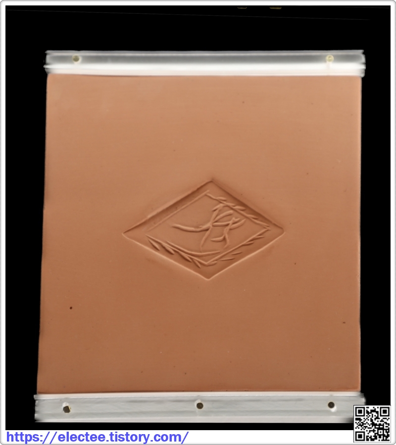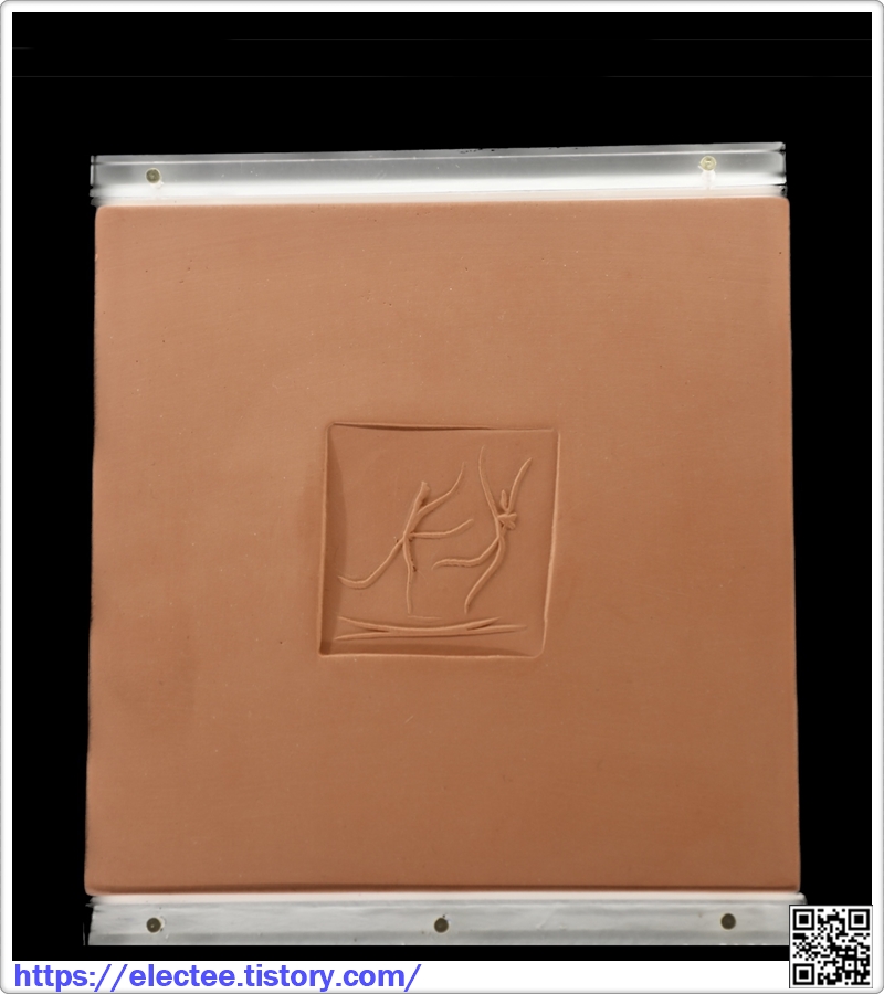 전시에는 리놀륨에 각인한 것을 석고판에 캐스팅한 후 점토나 테라코타판에 찍어낸 사각형의 타일형태가