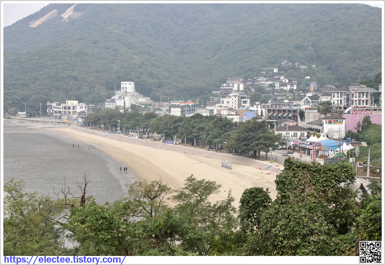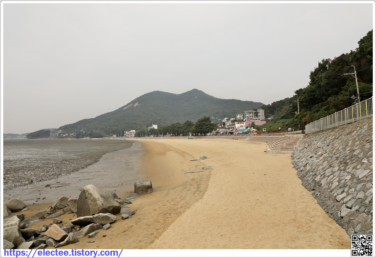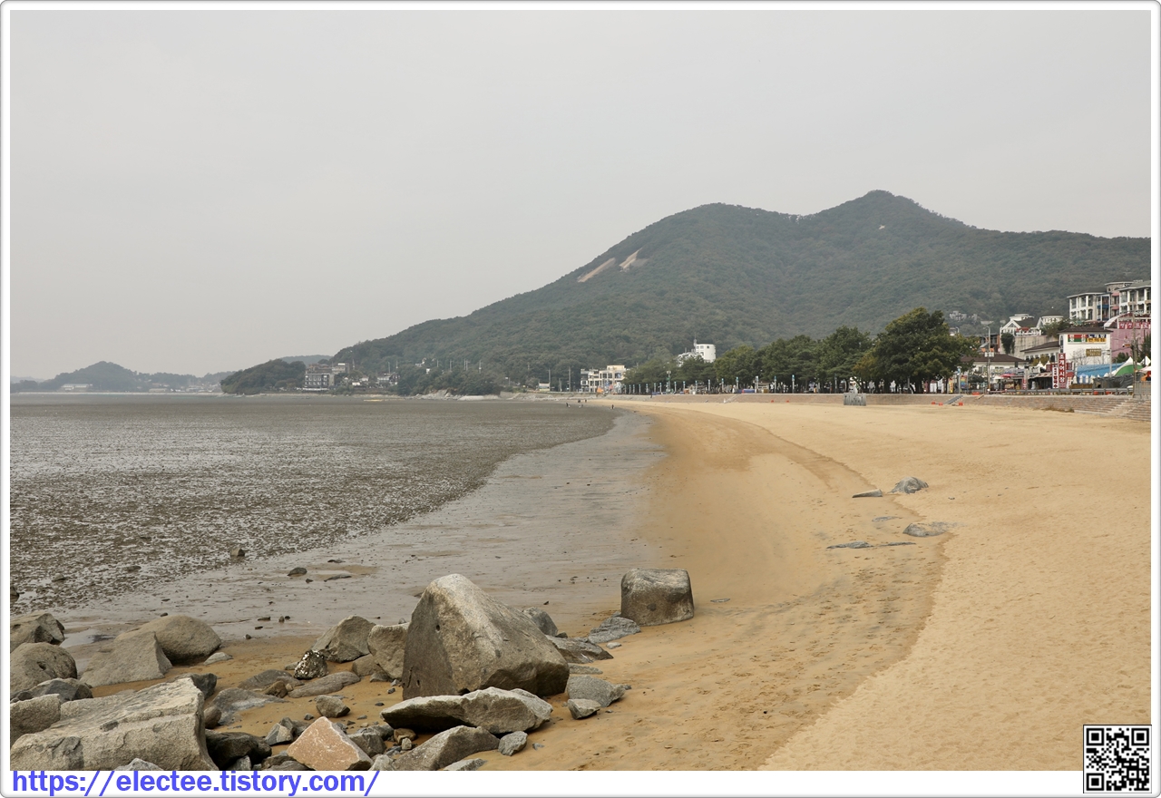 욕장 뒤로 소나무 그늘이 좋아 보이지만, 물이 빠지면 바다까지 나가기는 너무 멀다.