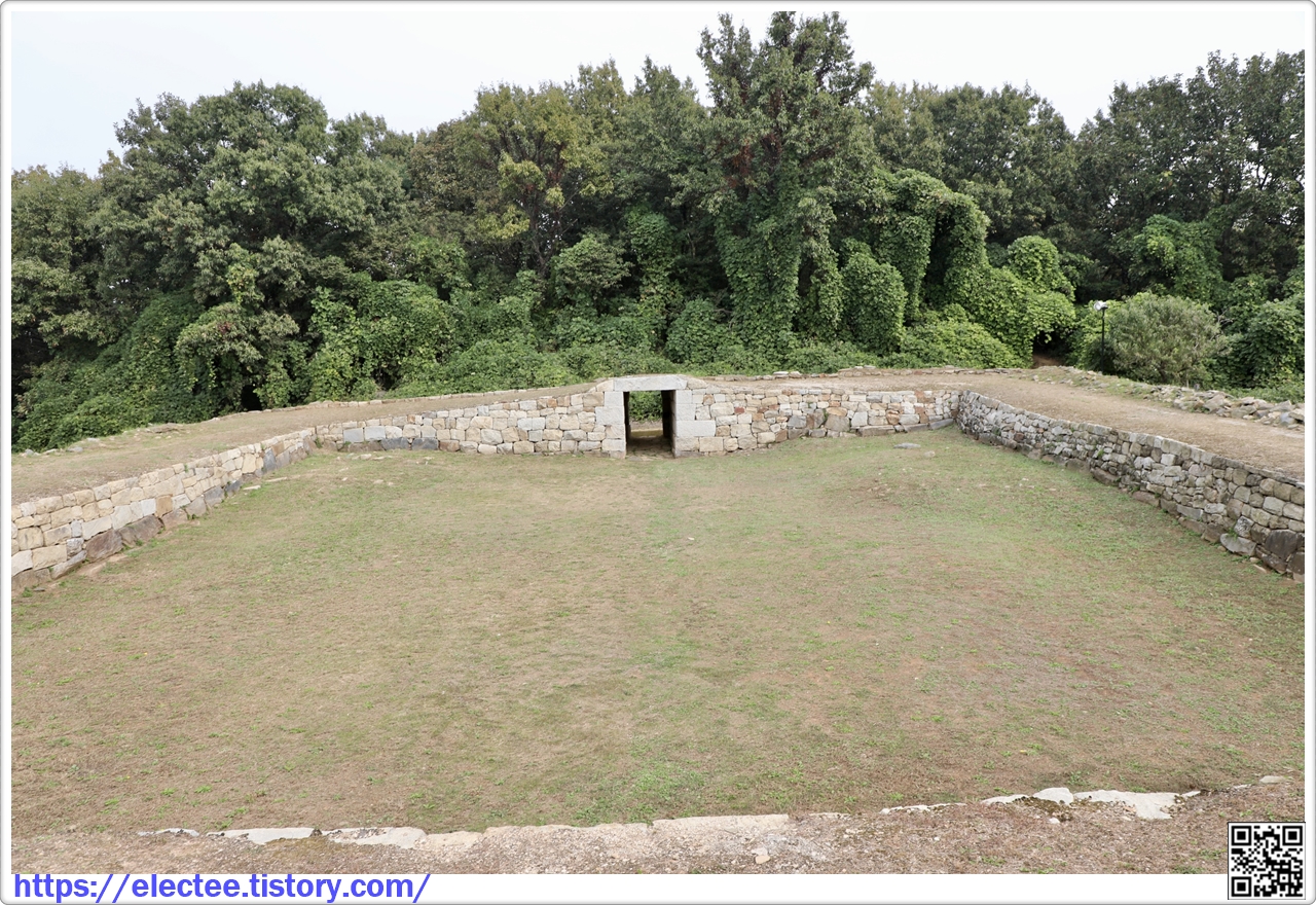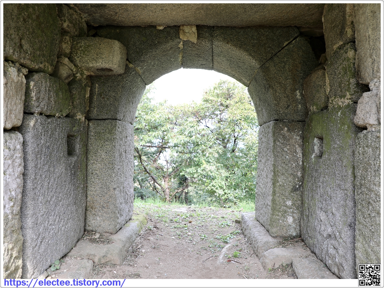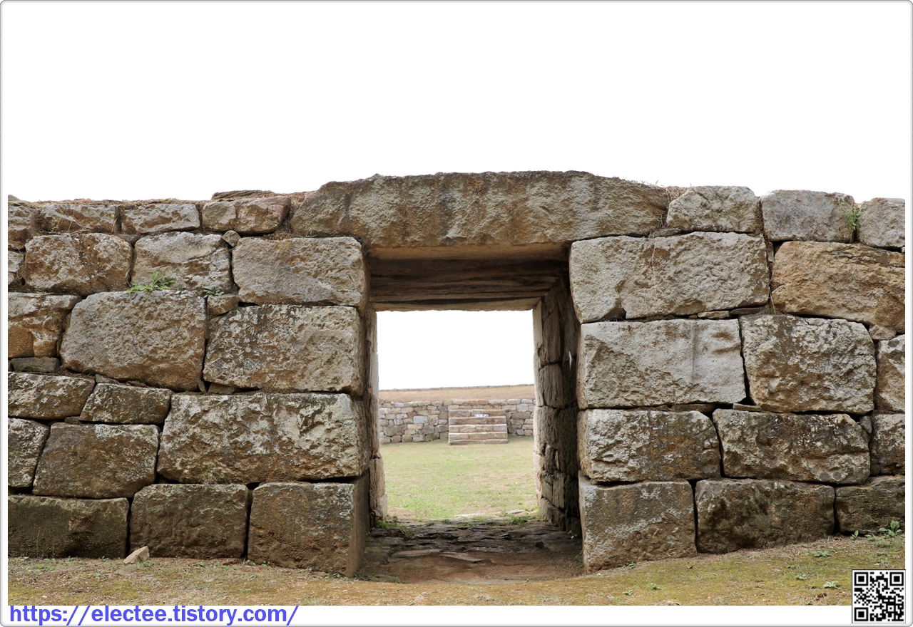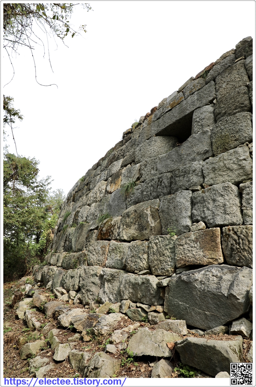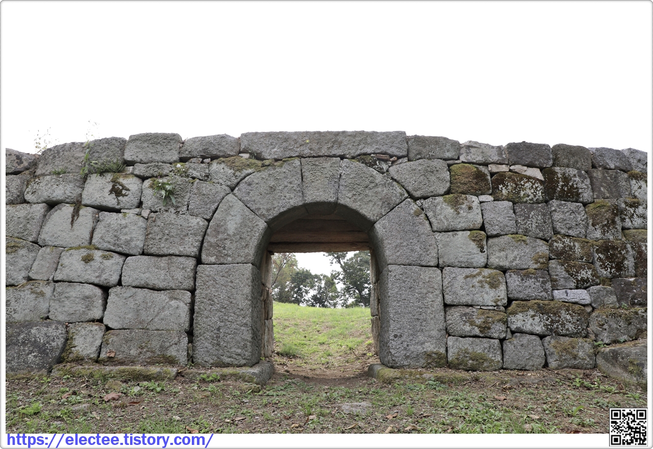 공격하기 위해 덧쌓은 낮은 담장을 두른 흔적이 남아 있다. 출입구는 무지개 모양의 홍예문이다.
