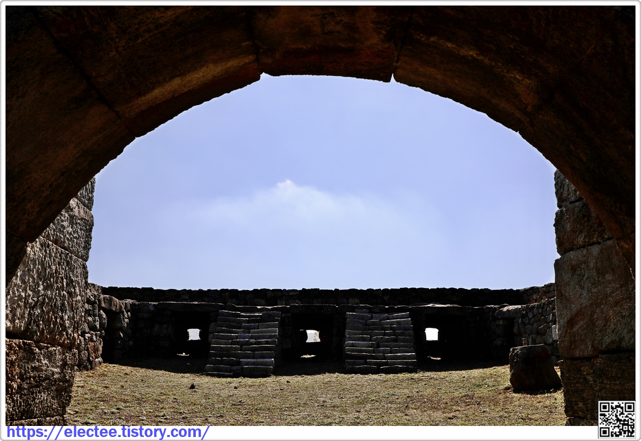 돈대의 홍예문에서 보는 포좌와 돈대 위로 올라가는 계단