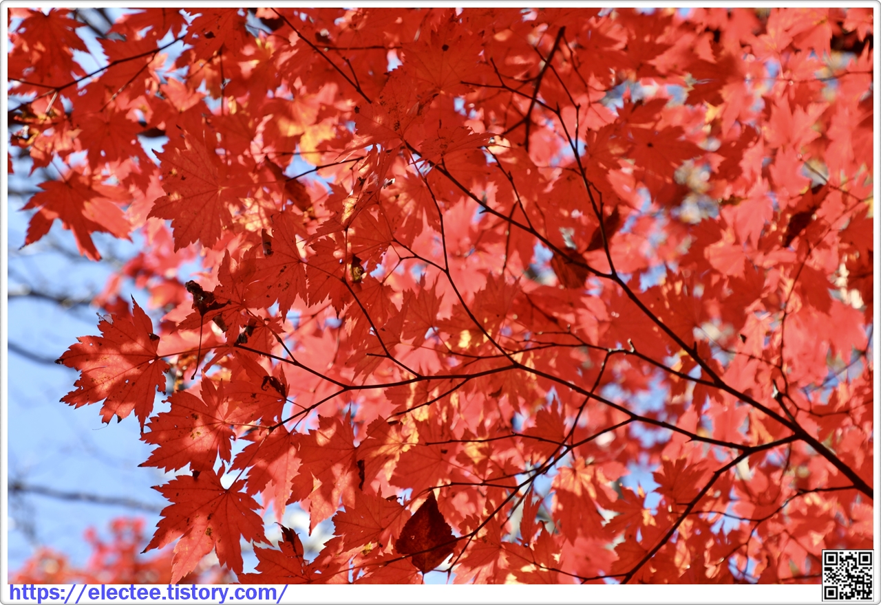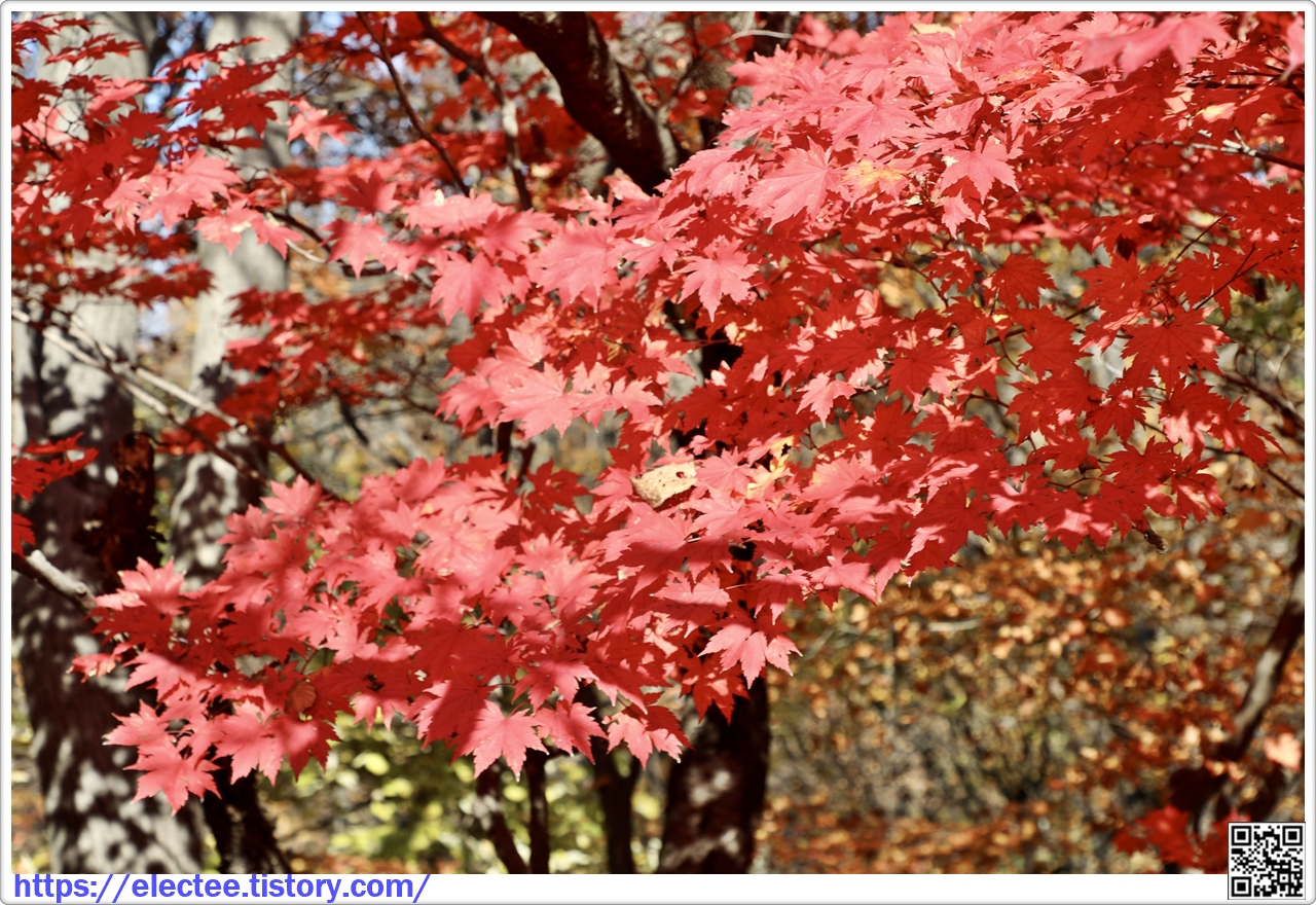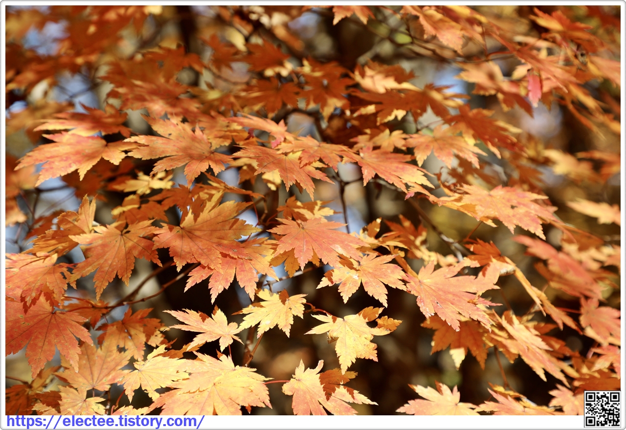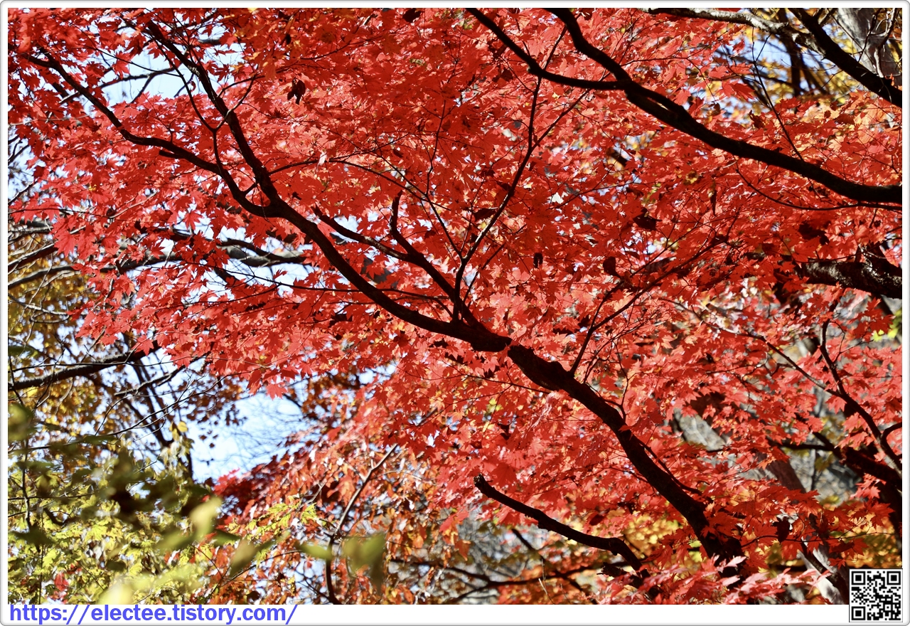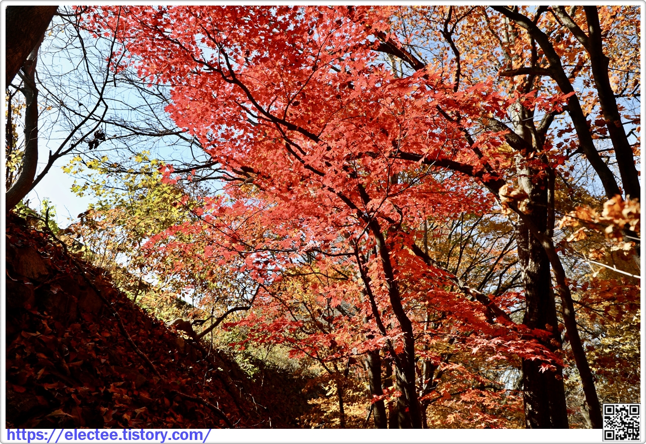 이 나무에서 떨어진 낙엽이 양탄자를 밟은 듯 푹신거릴 만큼 떨어졌어도 여전히 단풍이 아름답다.